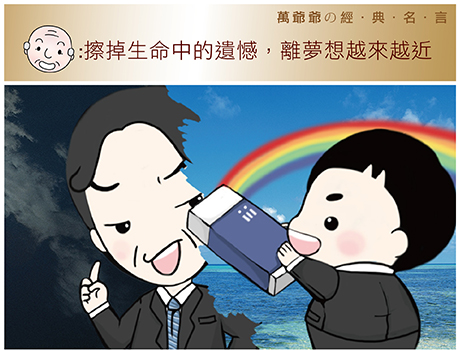 「遺憾」往往在心中形成一股無形的拉扯力量有時糢糊了人生方向有時阻礙了前進的勇氣即時的將遺憾寫下再勇敢的擦去你將會發現心。乾淨了人。輕鬆了方向。越來越清晰夢想也越來越近了