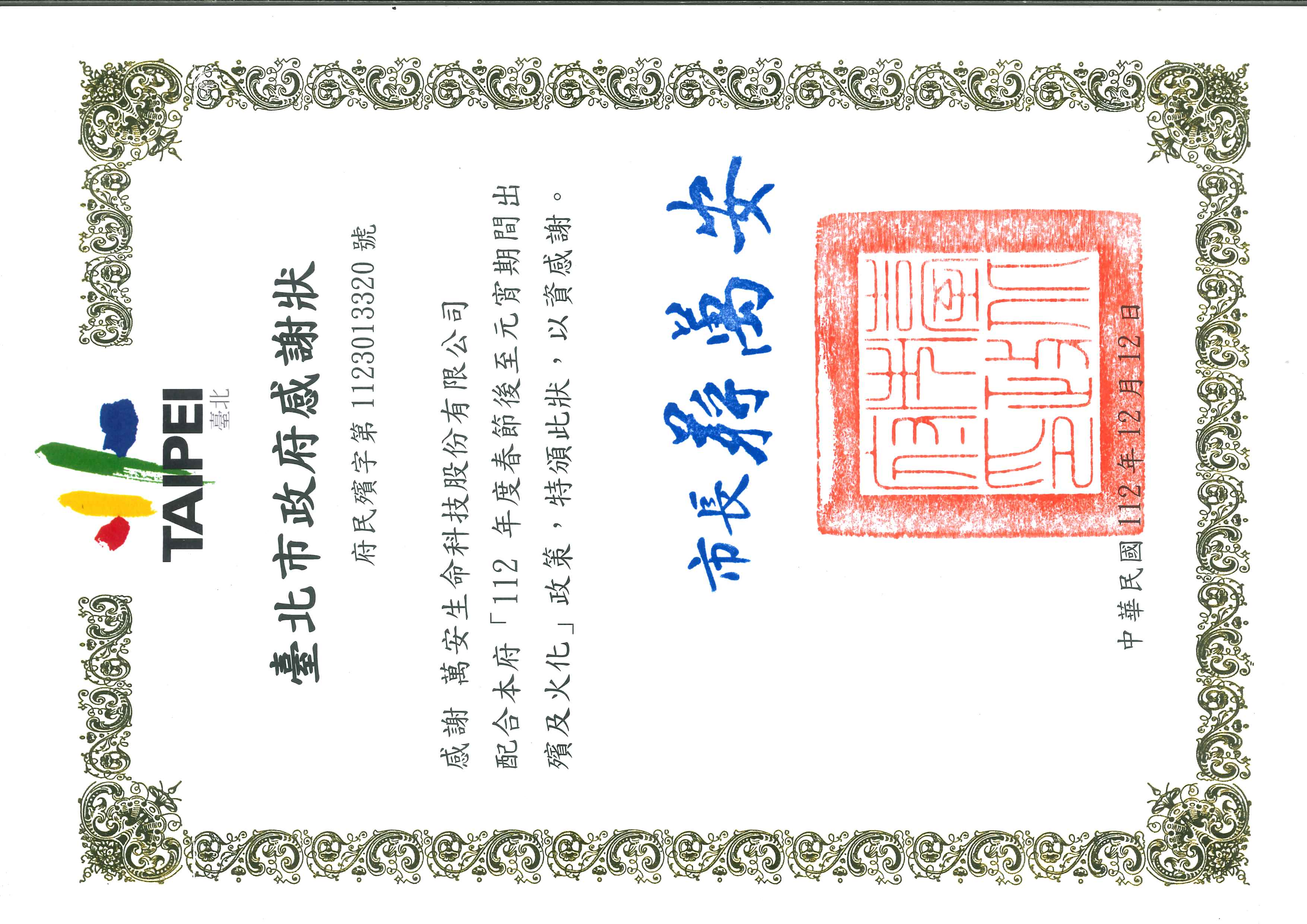 茲感謝萬安生命科技股份有限公司配合本府「112年度春節後至元宵節期間出殯及火化」政策,特頒此狀,以資感謝。