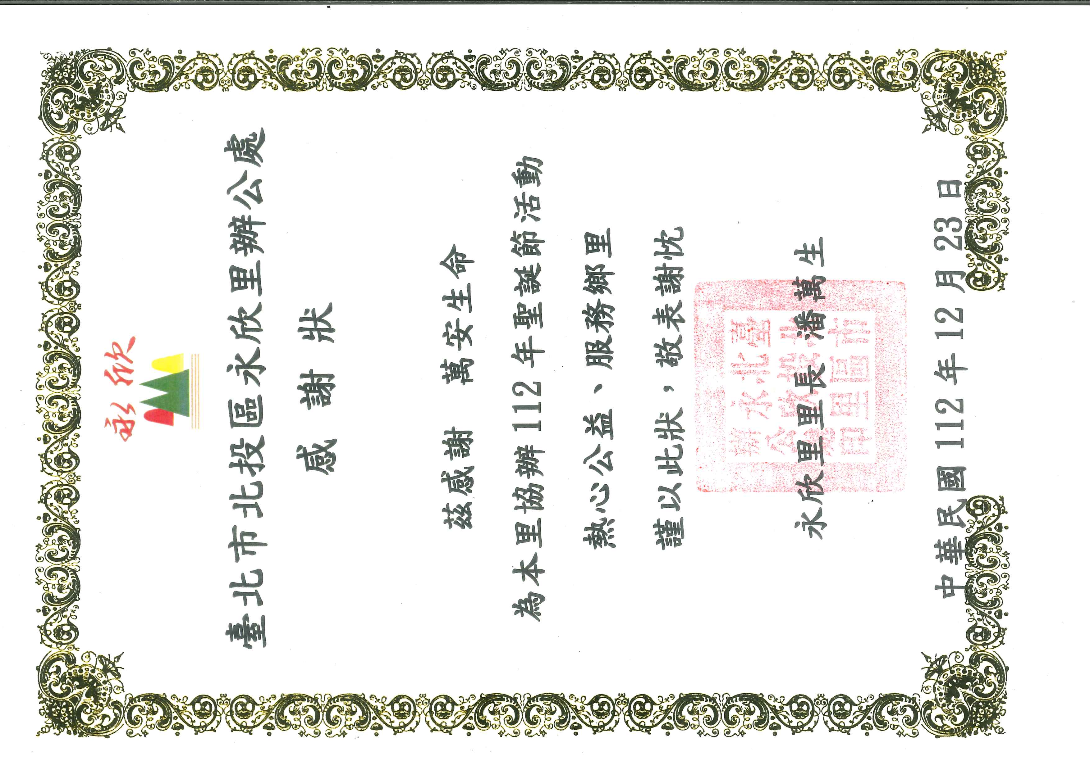 茲感謝萬安生命為本里協辦112年度聖誕節活動,熱心公益、服務鄉里,謹以此狀,敬表謝忱。