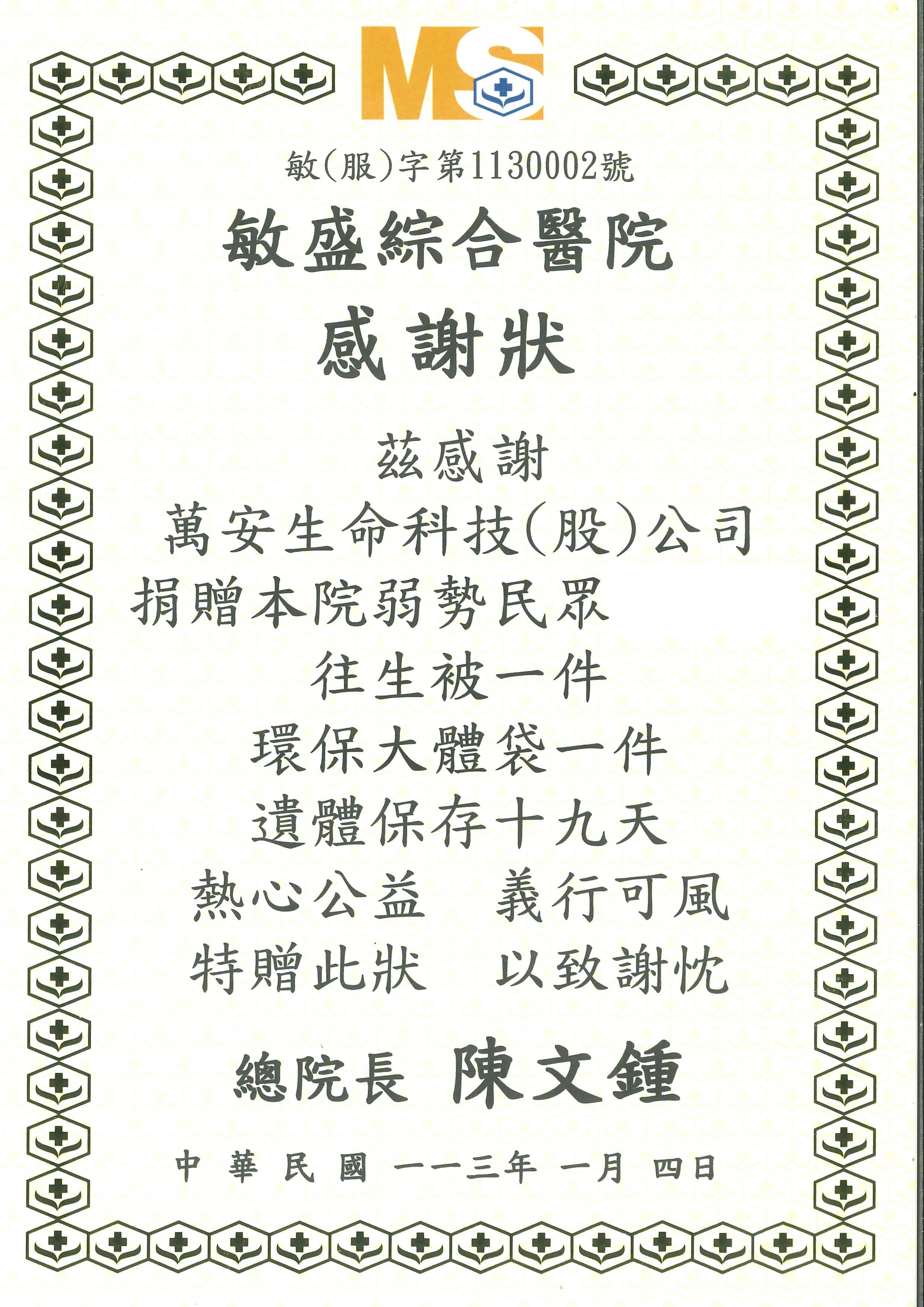 茲感謝萬安生命科技(股)公司捐贈本院弱勢民眾往生被一件、環保大體袋一件、遺體保存十九天,熱心公益,義行可風,特贈此狀,以致謝忱。