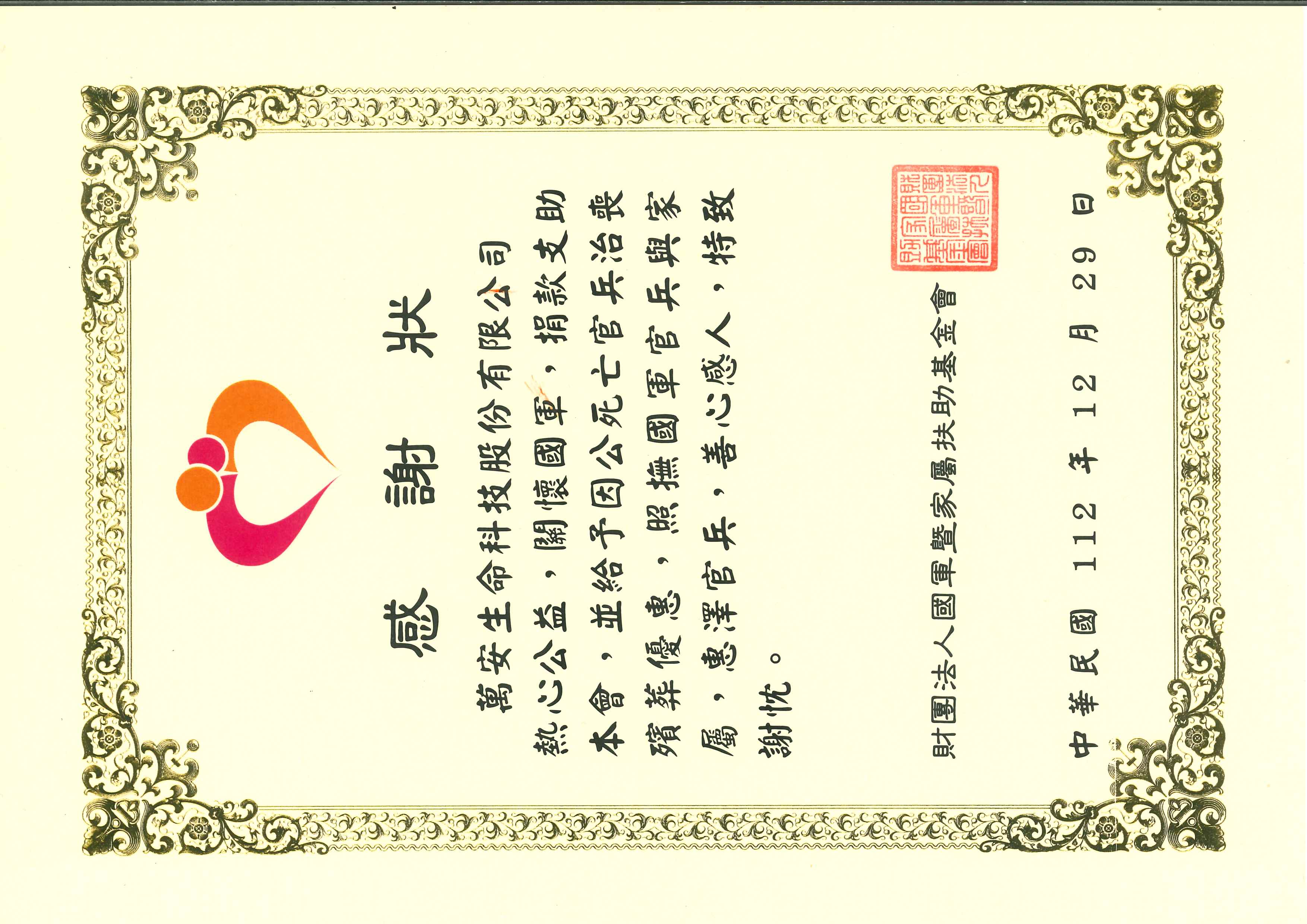 萬安生命科技股份有限公司熱心公益,關懷國軍,捐款支助本會,並給予因公死亡官兵治喪殯葬優惠,照撫國軍官兵與家屬,惠澤官兵,善心感人,特致謝忱。
