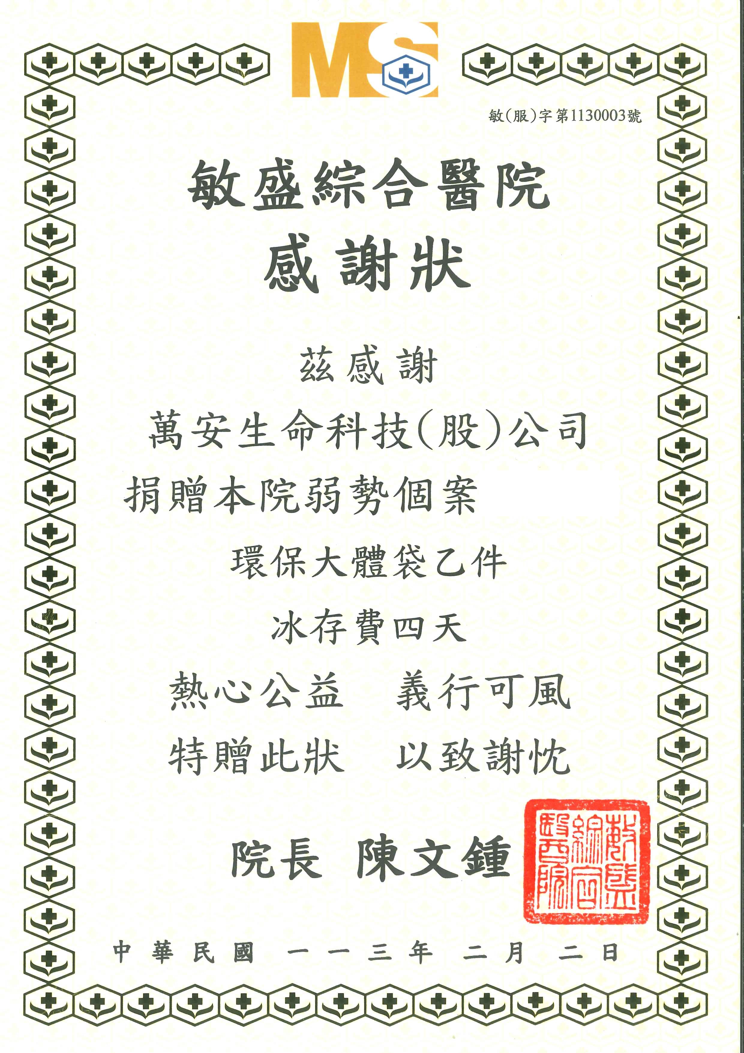 茲感謝萬安生命科技(股)公司捐贈本院弱勢個案環保大體袋乙件、冰存費四天,熱心公益,義行可風,特贈此狀,以致謝忱。