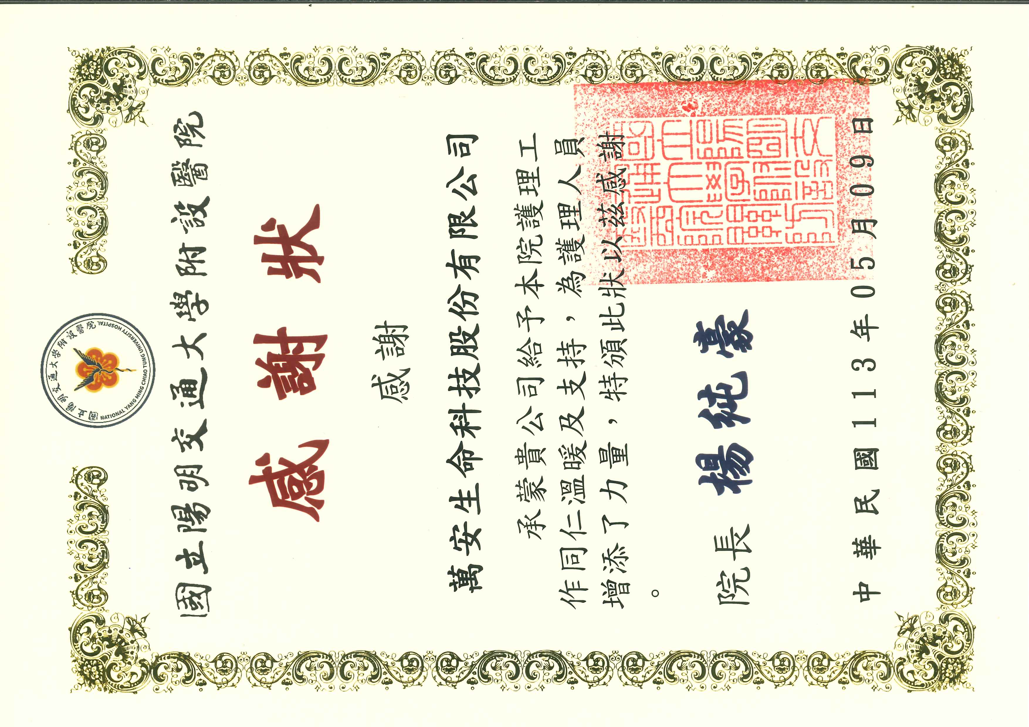 感謝萬安生命科技股份有限公司承蒙貴公司給予本院護理工作同仁溫暖及支持,為護理人員增添了力量,特頒此狀,以茲感謝。