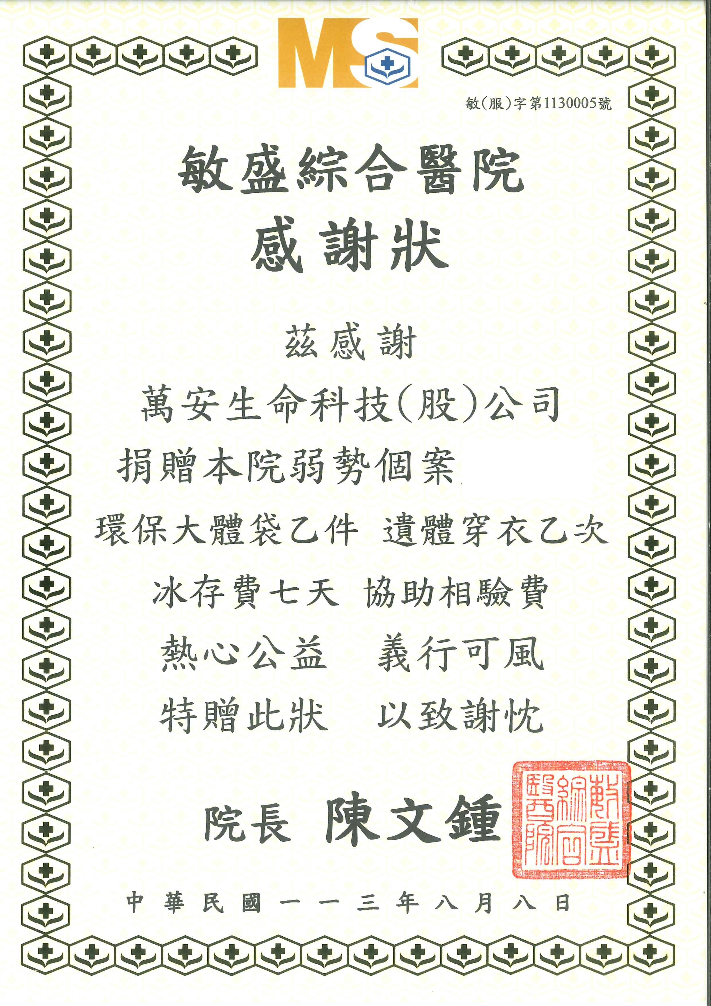 茲感謝萬安生命科技(股)公司捐贈本院弱勢個案環保大體袋乙件,遺體穿衣乙次,冰存費七天,協助相驗費,熱心公益,義行可風,特贈此狀,以致謝忱。