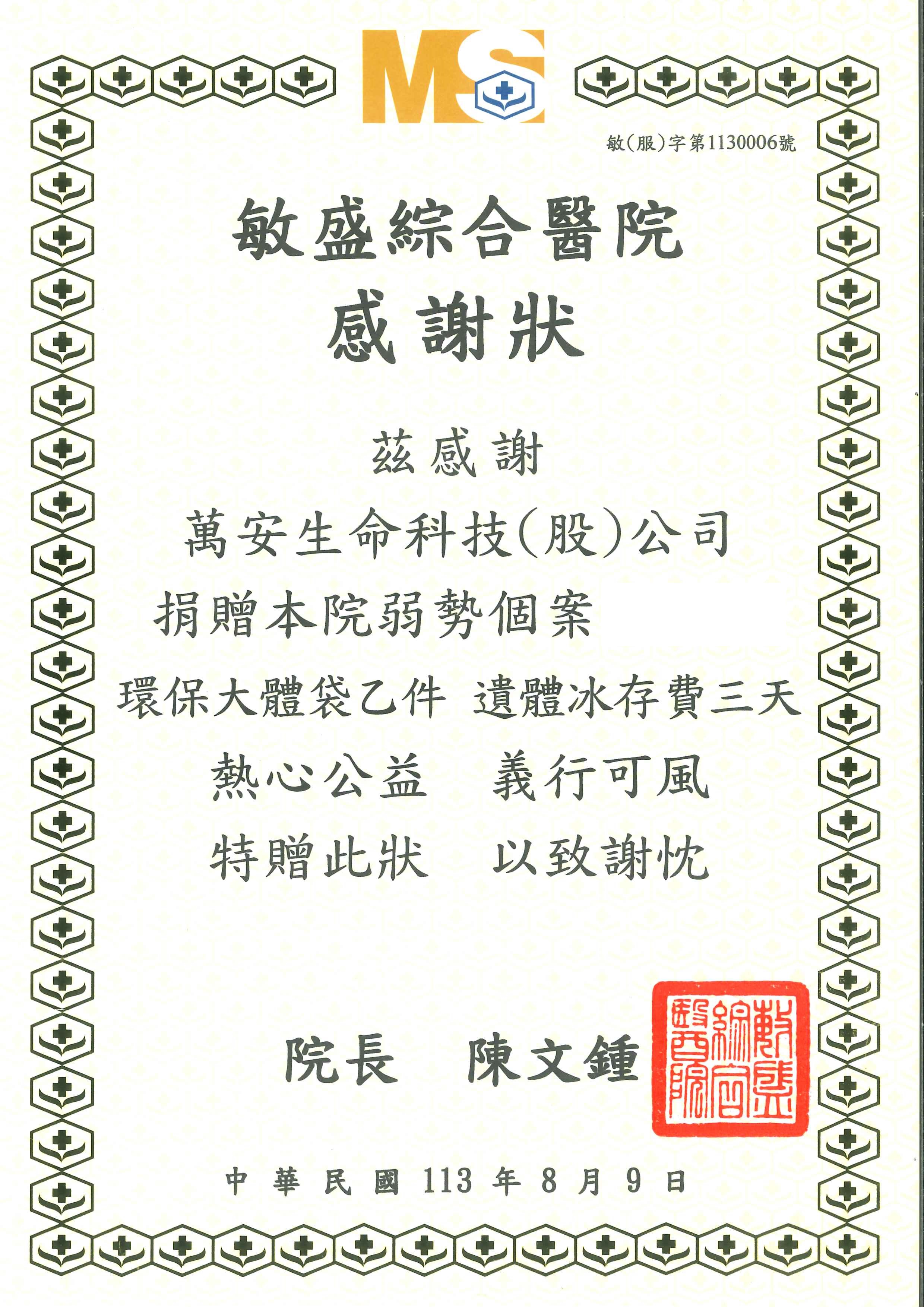 茲感謝萬安生命科技(股)公司捐贈本院弱勢個案環保大體袋乙件,遺體冰存費三天,熱心公益,義行可風,特贈此狀,以致謝忱。