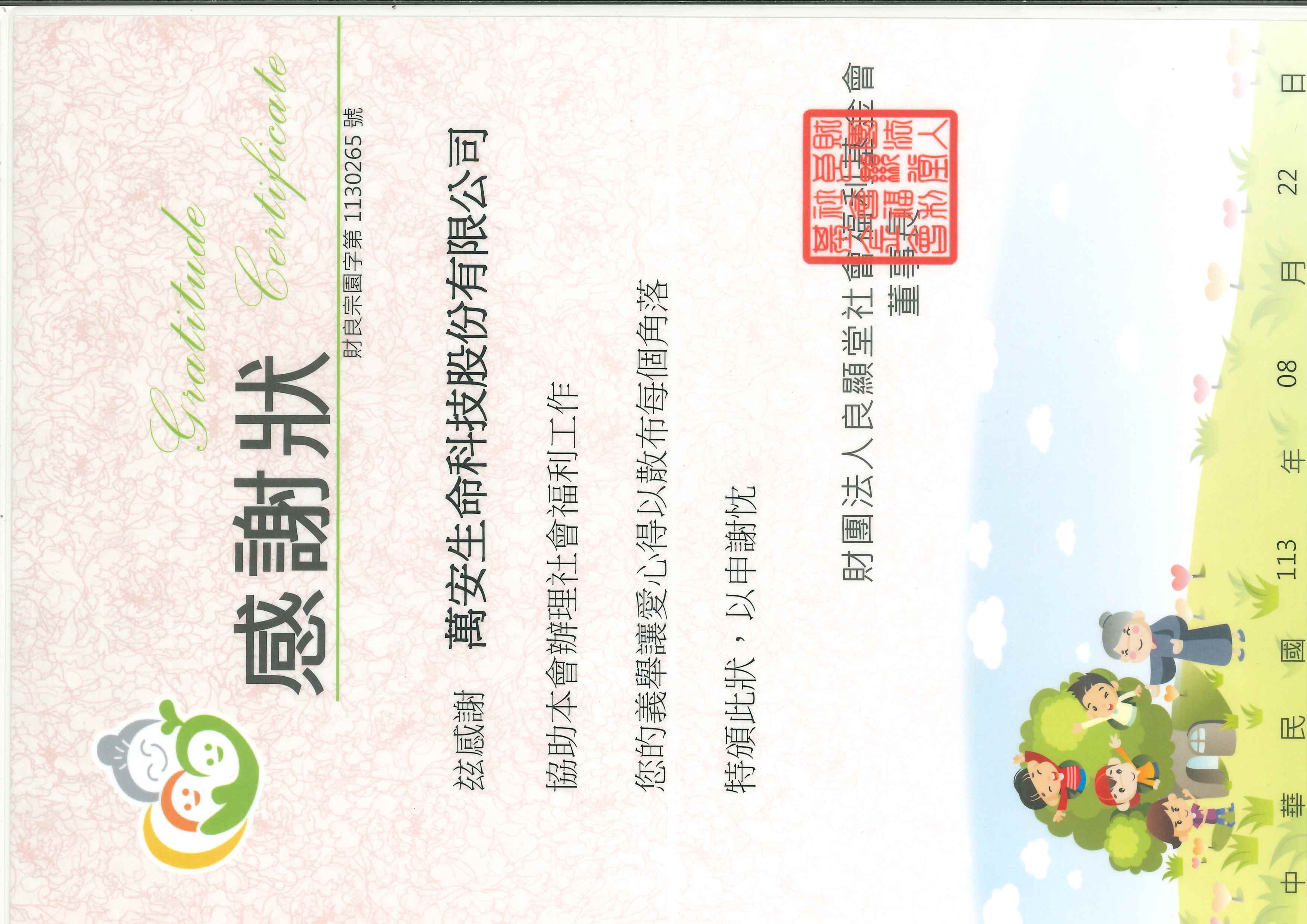 茲感謝萬安生命科技股份有限公司協助本會辦理社會福利工作,您的義舉讓愛心得以散布每個角落,特頒此狀,以申謝忱。