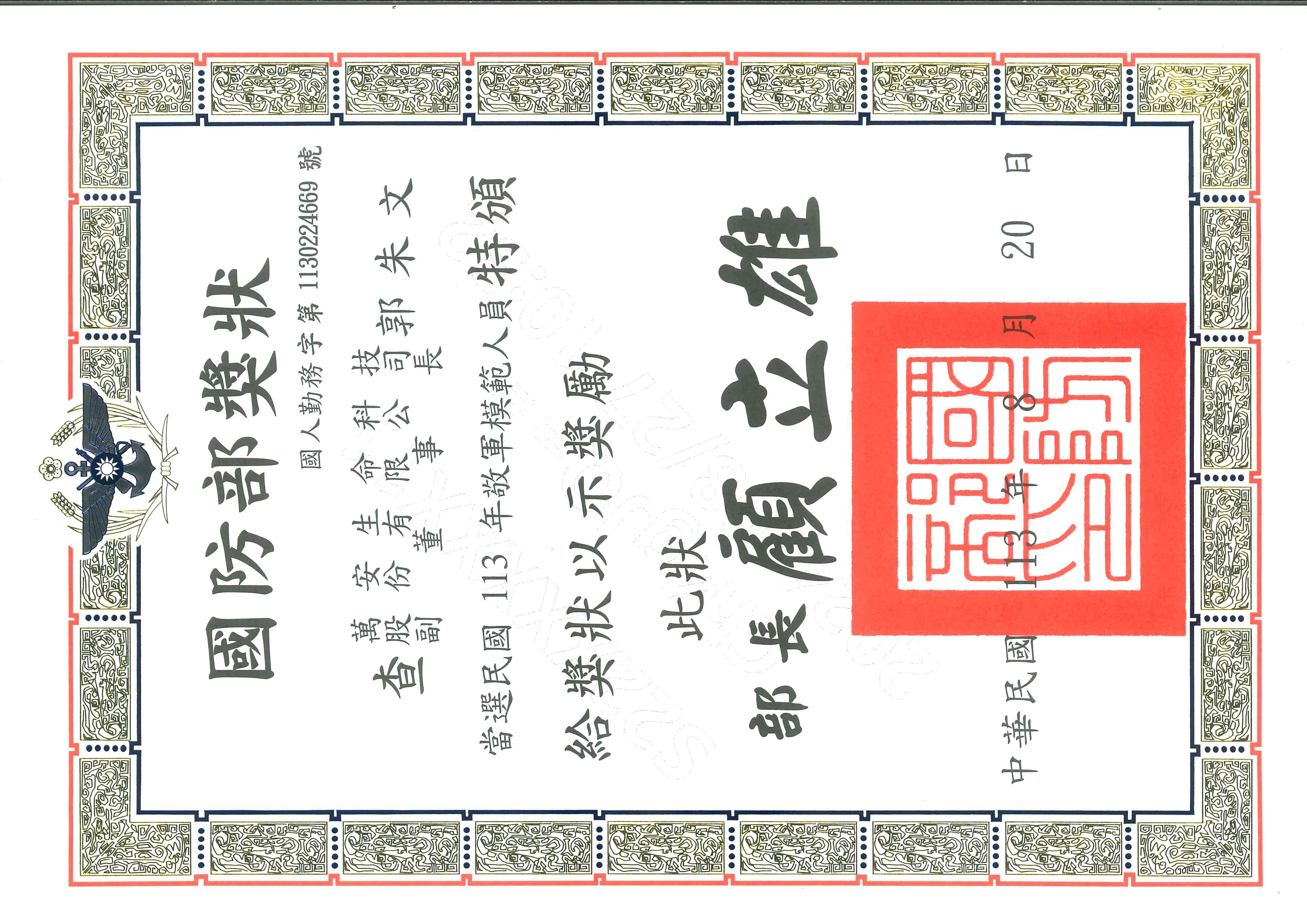 查萬安生命科技股份有限公司副董事長郭朱文當選民國113年敬軍模範人員特頒給獎狀以示獎勵。