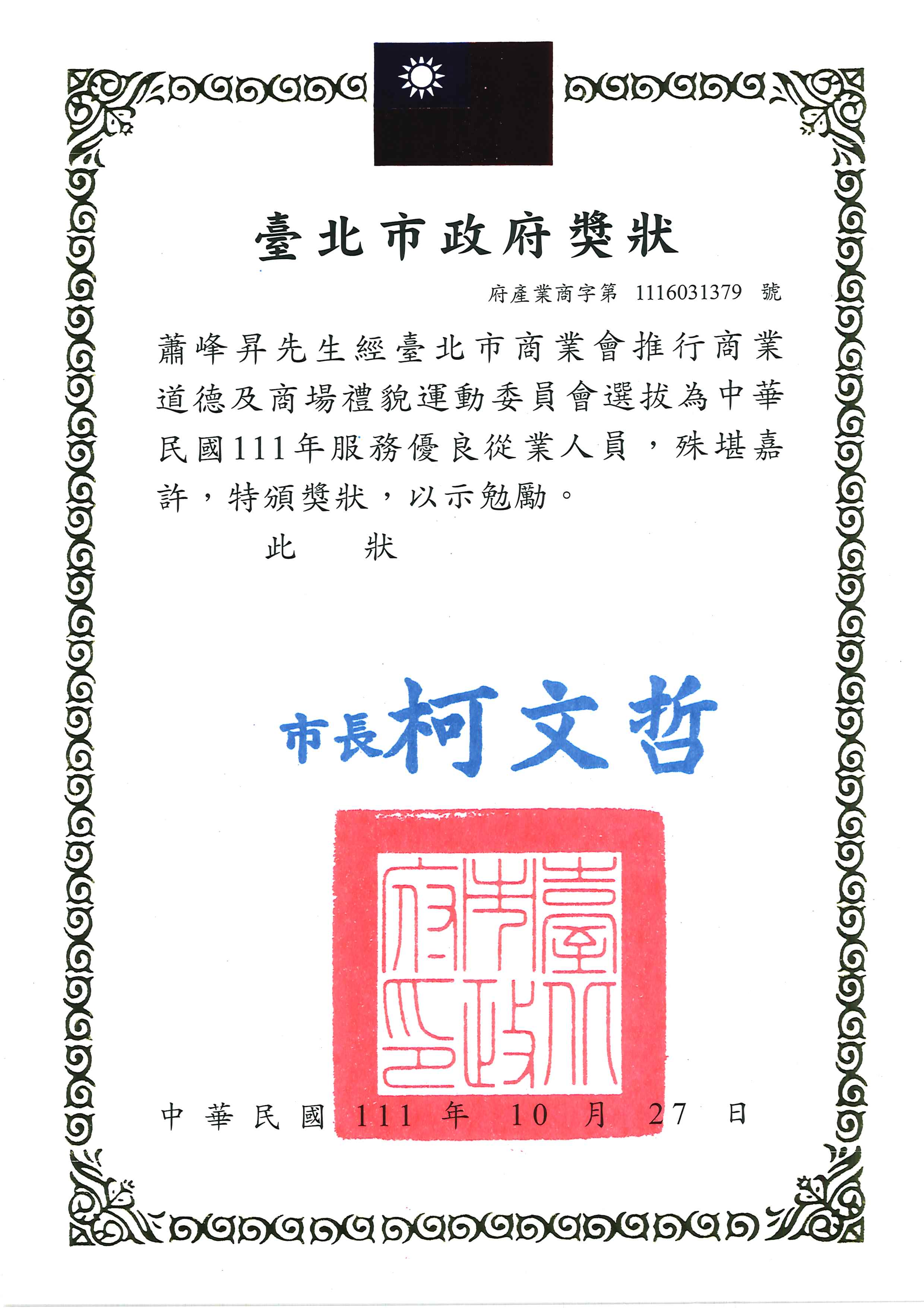 蕭峰昇先生經臺北市商業會推行商業道德及商常禮貌運動委員會選拔為中華民國111年服務優良從業人員