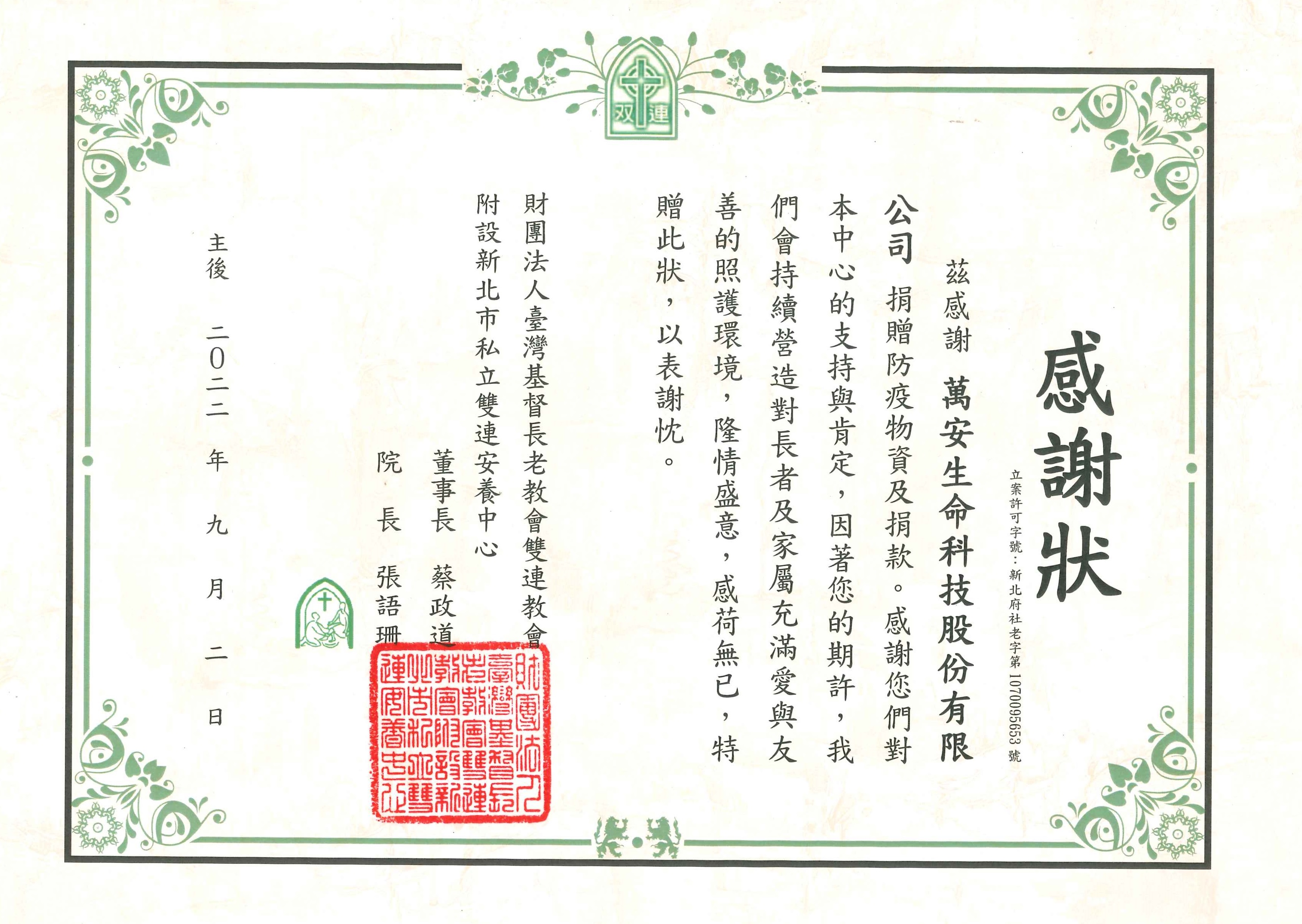 捐贈財團法人臺灣基督長老教會雙連教會附設新北市私立雙連安養中心防疫物資及捐款