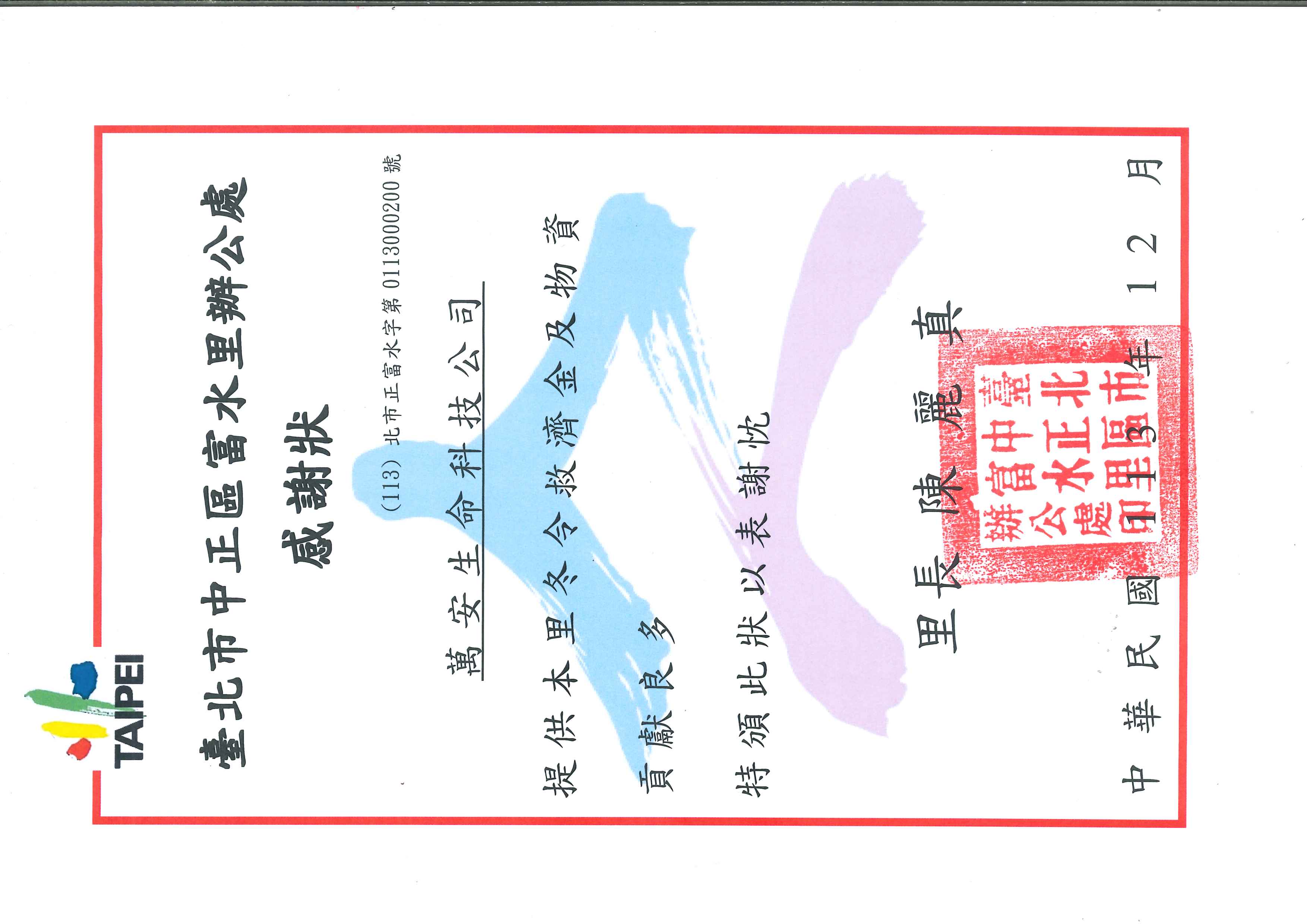 萬安生命科技公司提供本里冬令救濟金及物資貢獻良多,特頒此狀,以表謝忱