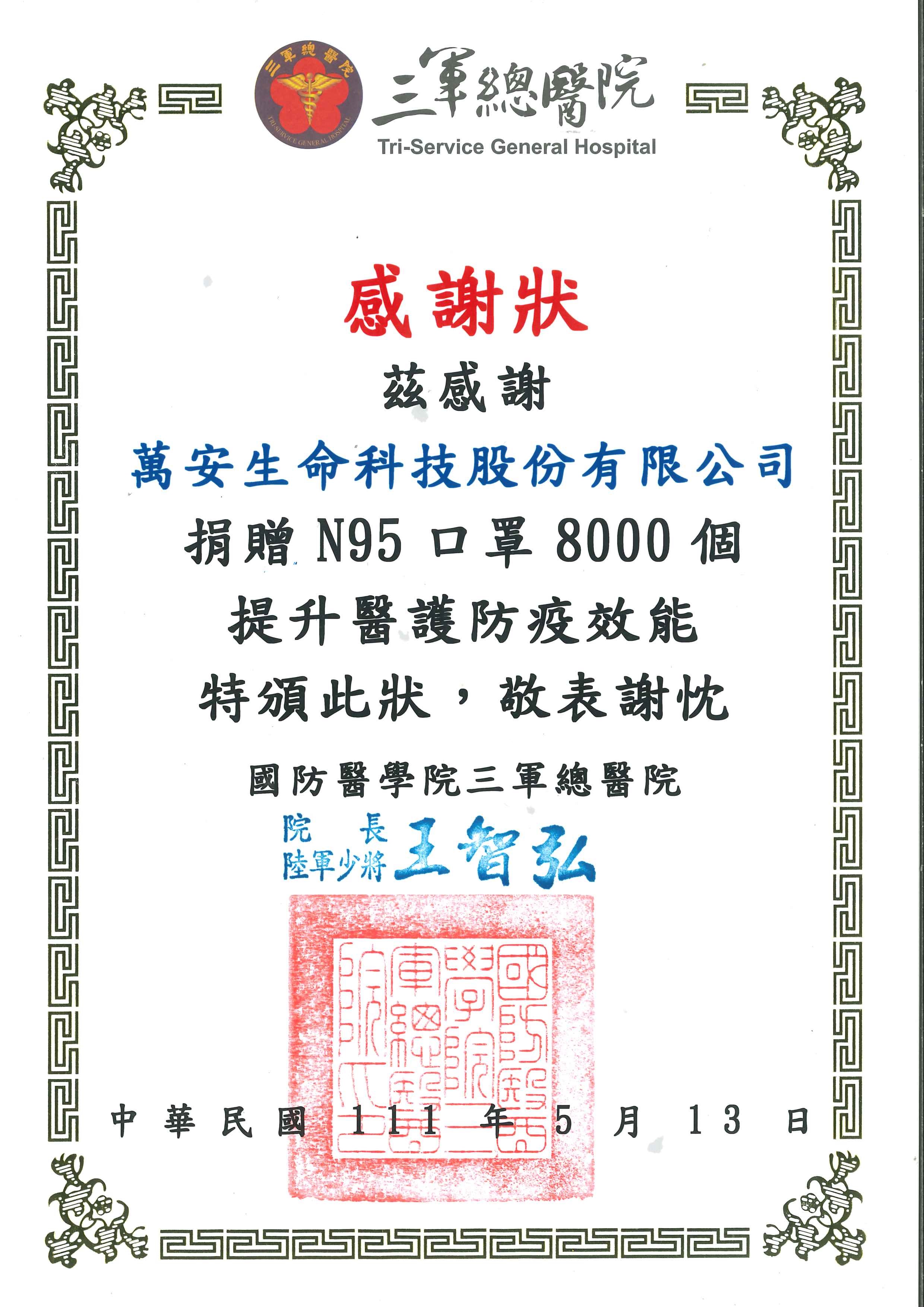 捐贈國防醫學院三軍總醫院N95口罩8000個,提升醫護防疫效能
