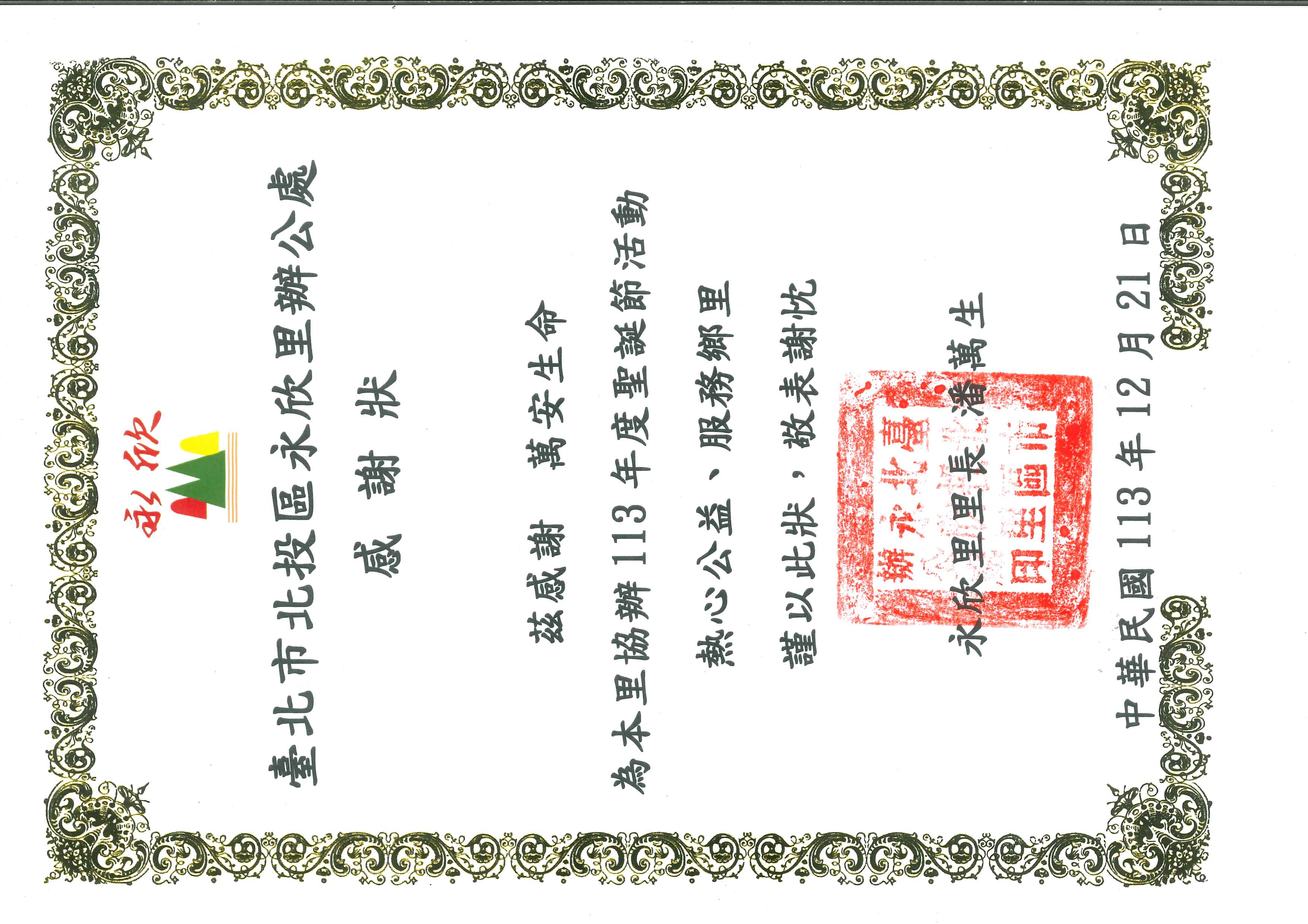 茲感謝萬安生命為本里協辦113年度聖誕節活動熱心公益、服務鄉里,謹以此狀,敬表謝忱。