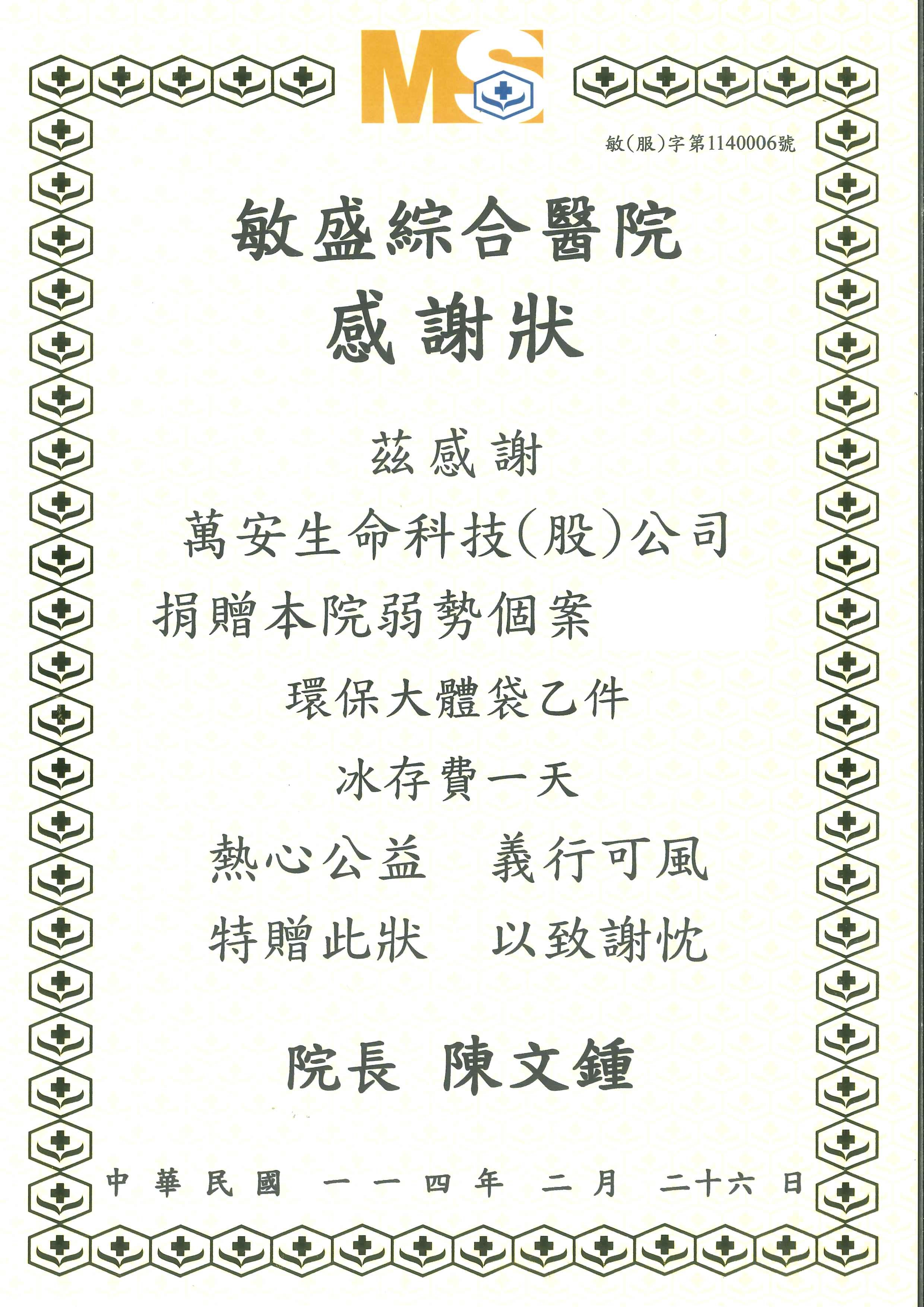 茲感謝萬安生命科技(股)公司捐贈本院弱勢個案環保大體袋乙件、冰存費一天,熱心公益,義行可風,特贈此狀,以致謝忱。