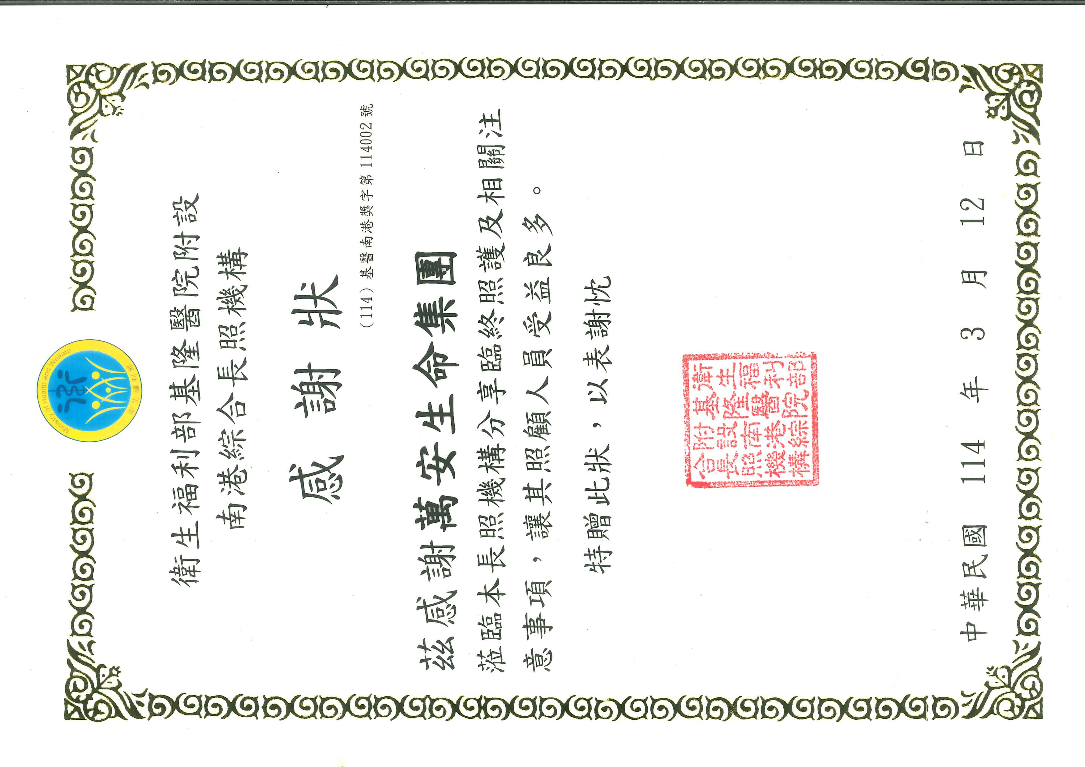 茲感謝萬安生命集團蒞臨本長照機構分享臨終照護及相關注意事項,讓其照顧人員受益良多。特贈此狀,以表謝忱。