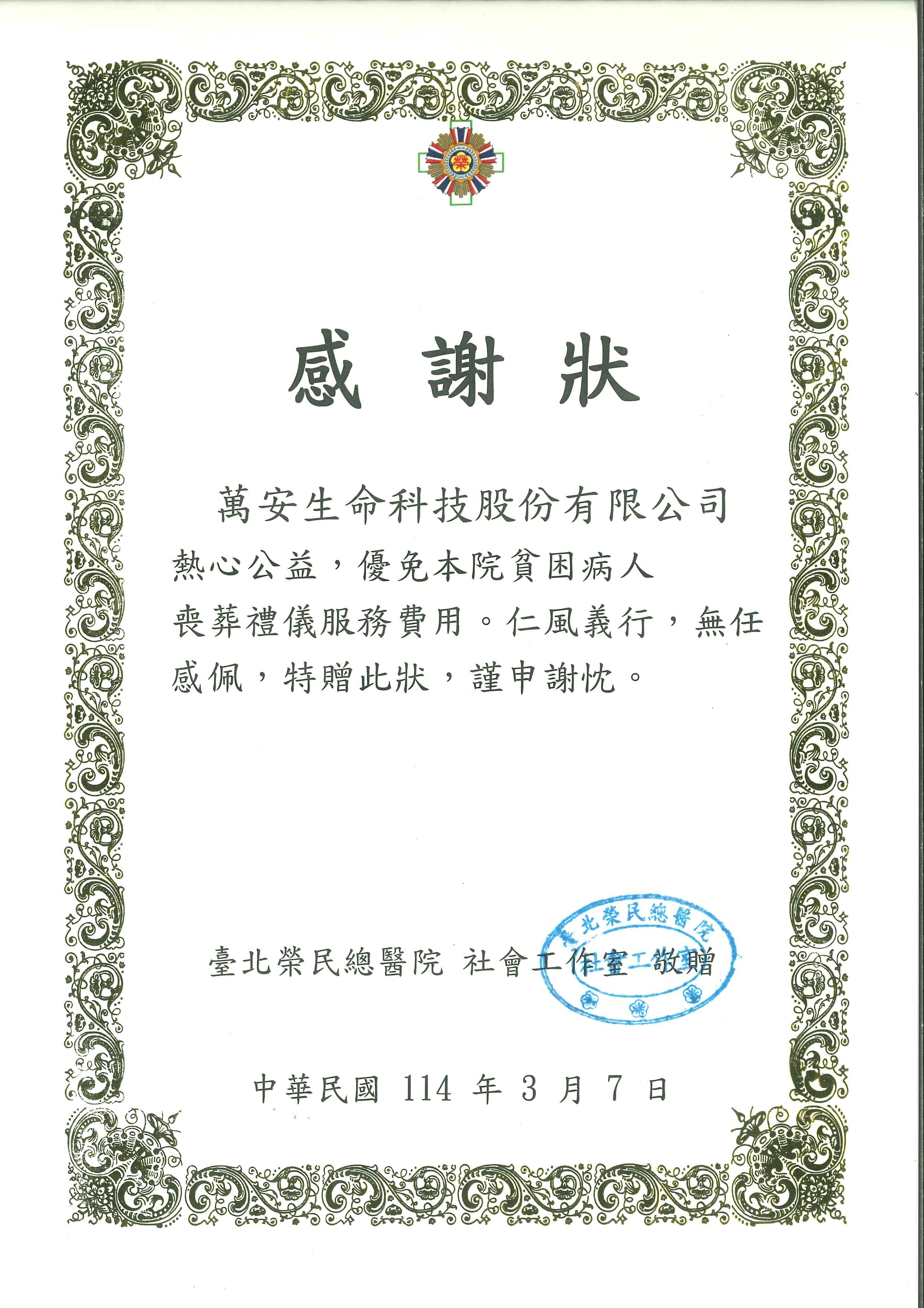 萬安生命科技股份有限公司熱心公益,優免本院貧困病人喪葬禮儀服務費用。仁風義行,無任感佩,特贈此狀,謹申謝忱。