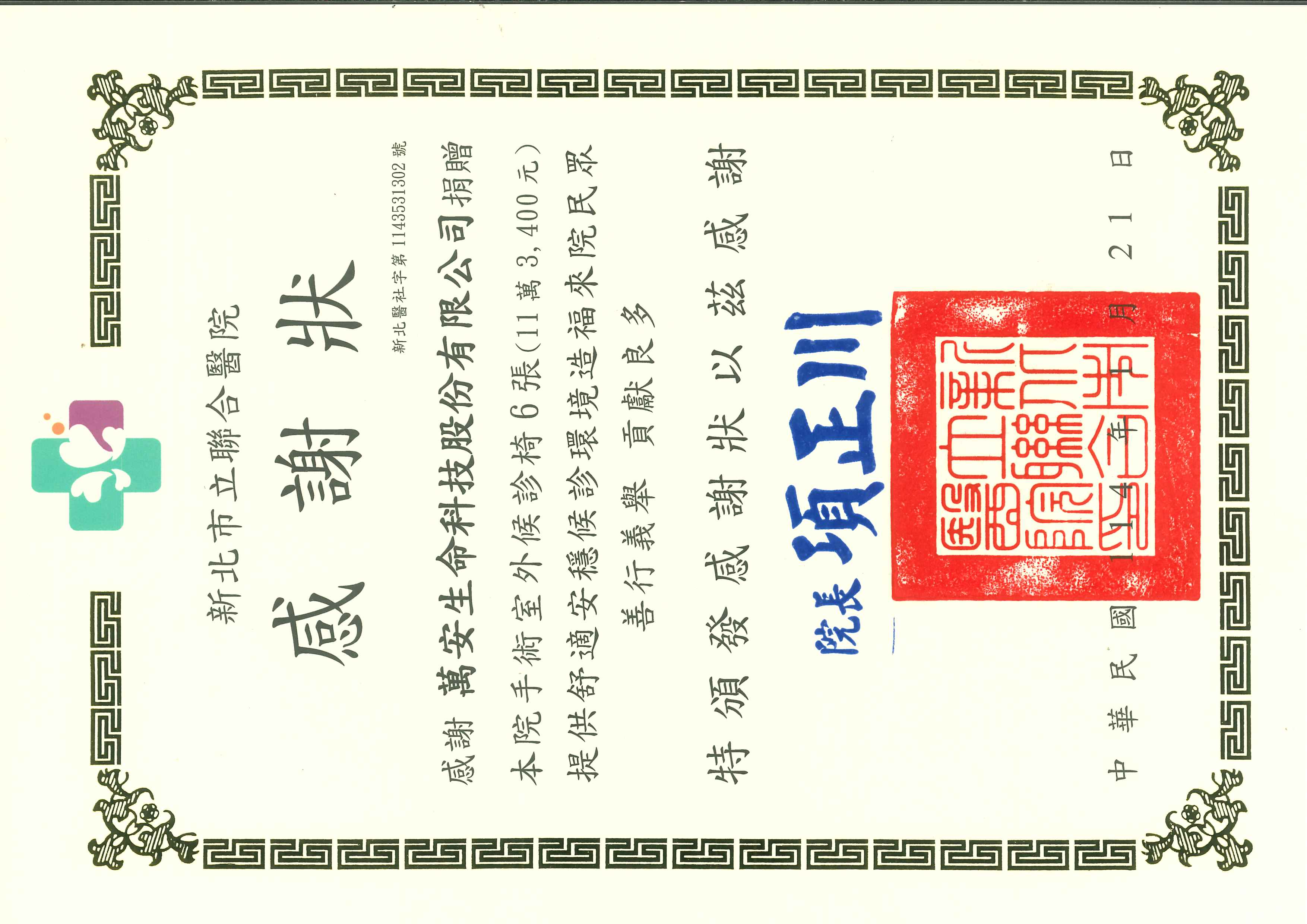 感謝萬安生命科技股份有限公司捐贈本院手術室外候診椅6張(11萬3,400元),提供舒適安穩候診環境,造福來院民眾,善行義舉,貢獻良多,特頒發感謝狀,以茲感謝。