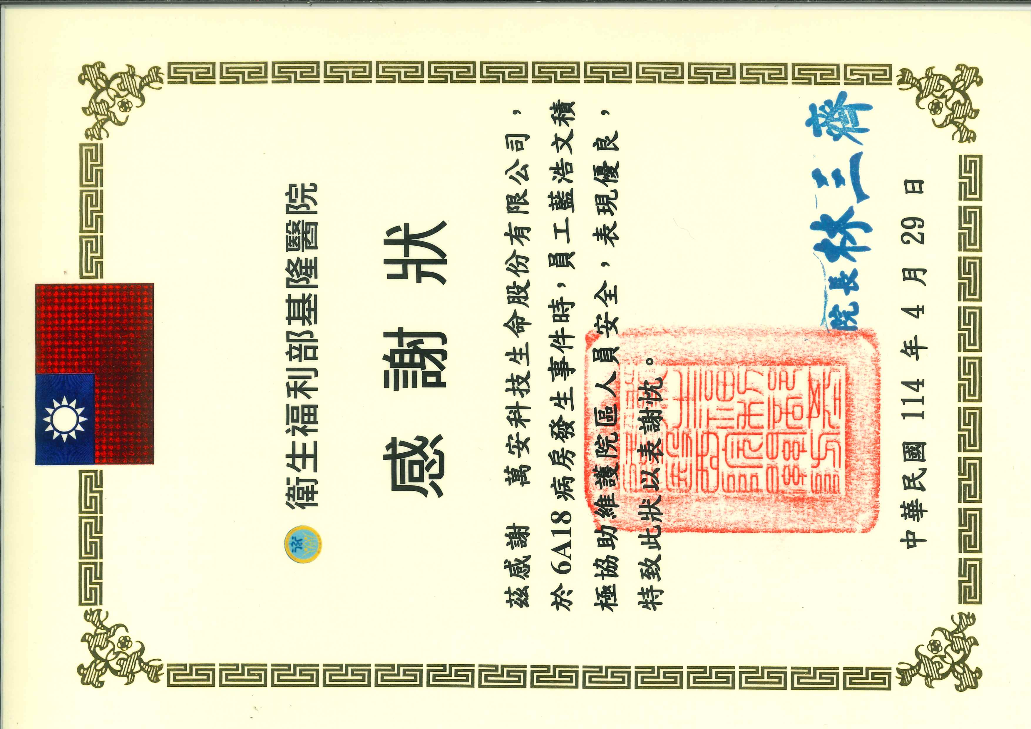 茲感謝萬安生命科技股份有限公司,於6A18病房發生事件時,員工藍浩文積極協助維護院區人員安全,表現優良,特致此狀以表謝忱。