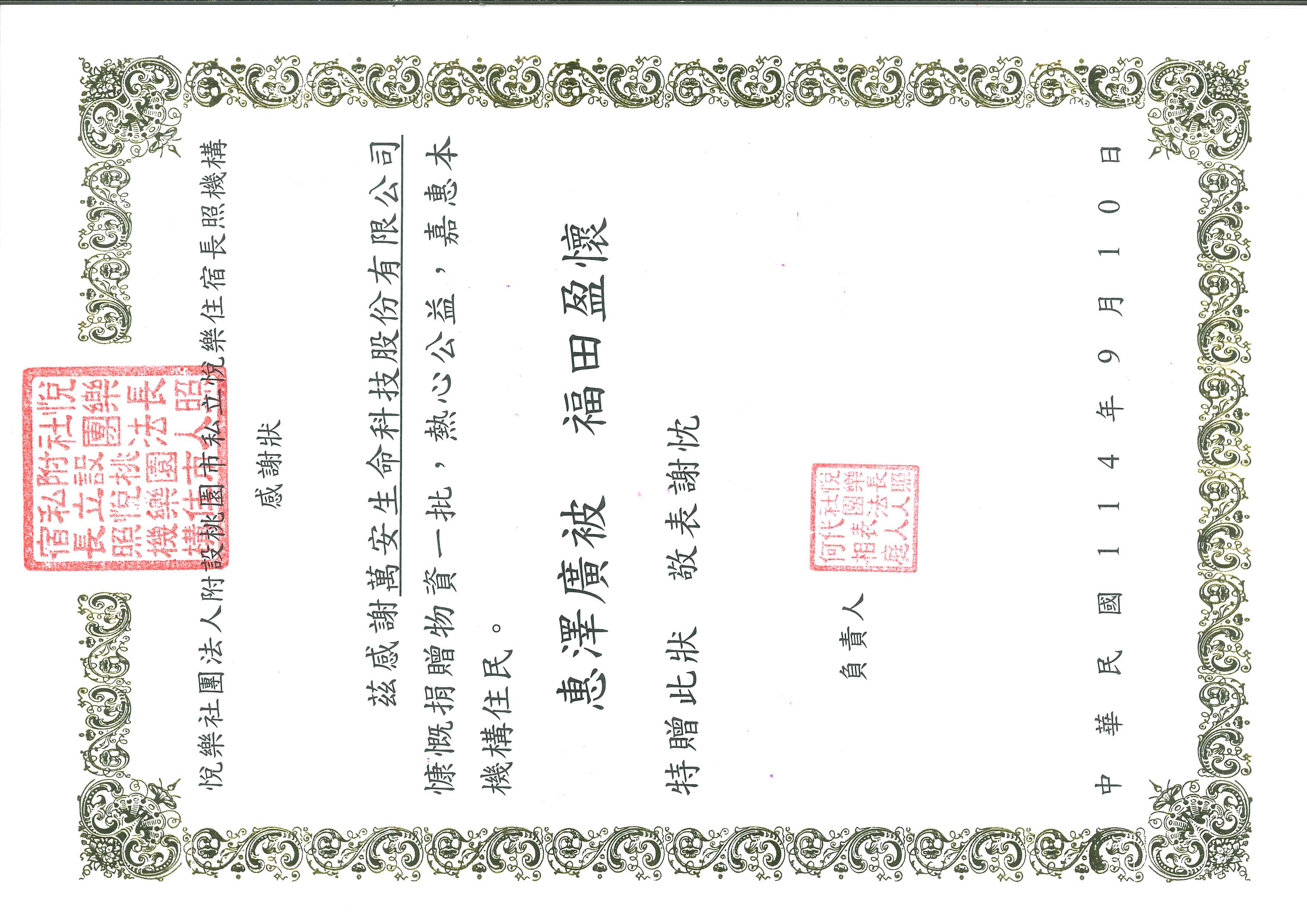 茲感謝萬安生命科技股份有限公司慷慨捐贈物資一批,熱心公益,嘉惠本機構住民。惠澤廣被,福田盈懷,特贈此狀,敬表謝忱。