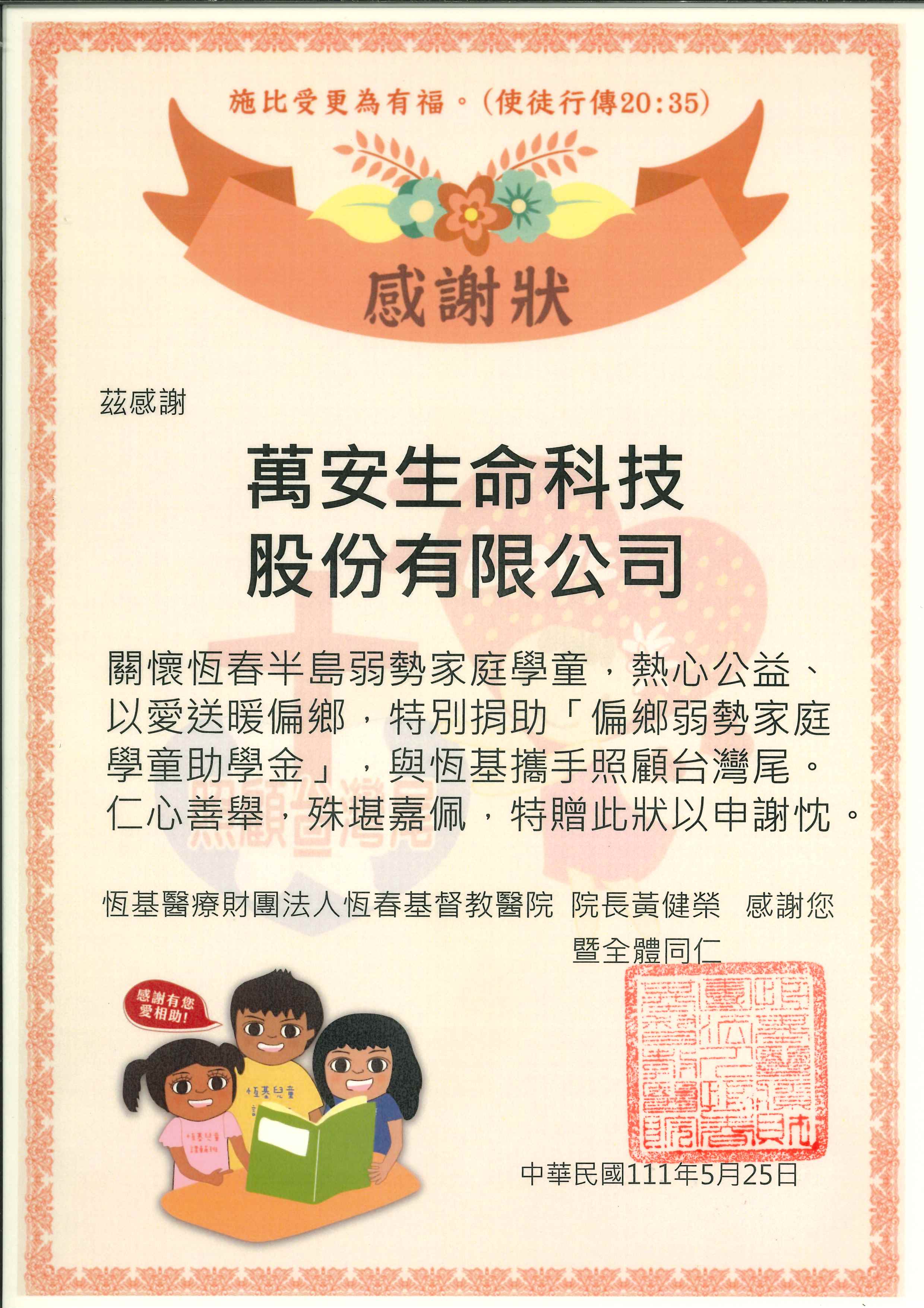 恆基醫療財團法人恆春基督教醫院感謝萬安生命特別捐助「偏鄉弱勢家庭學童助學金」