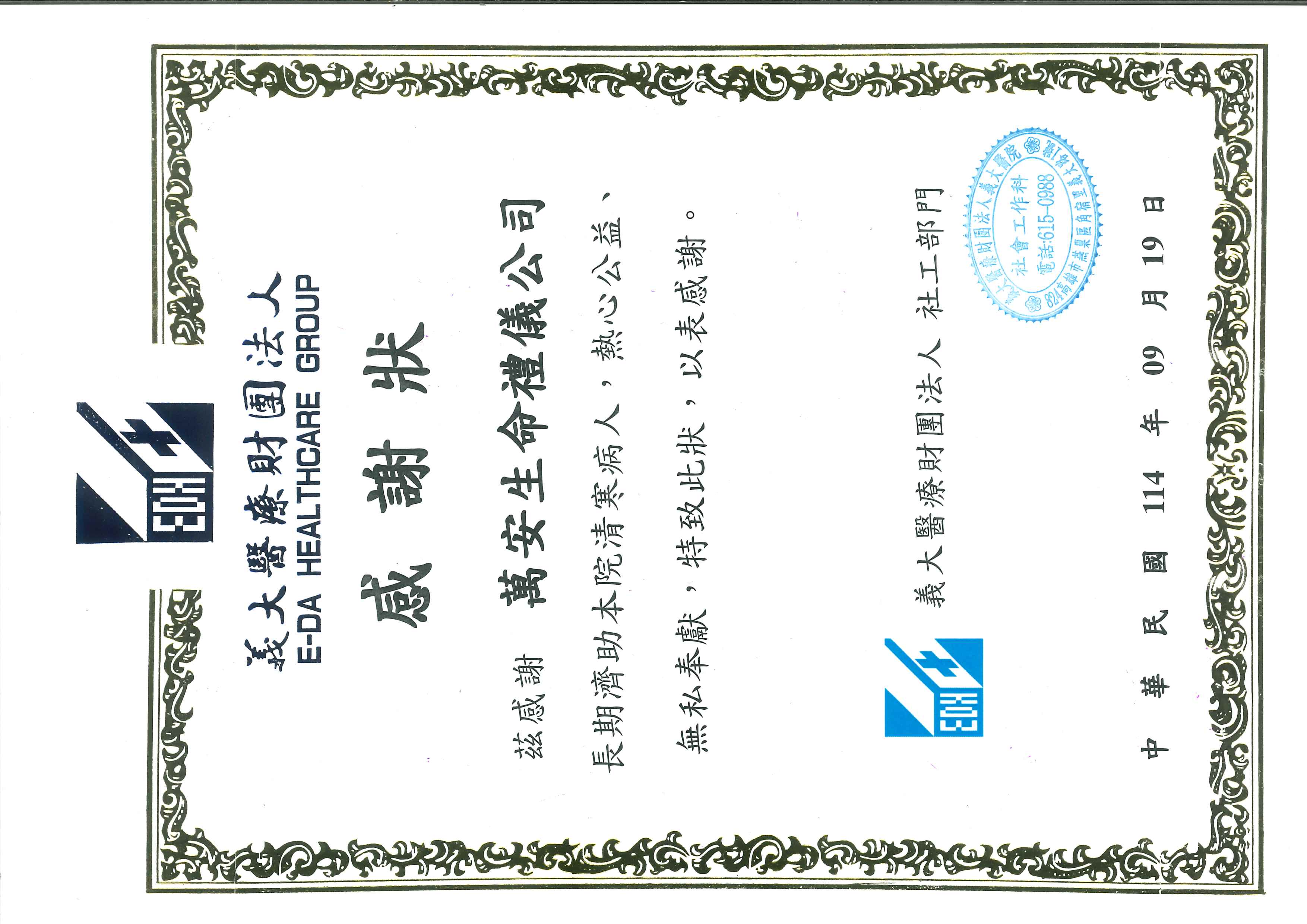 茲感謝萬安生命禮儀公司長期濟助本院清寒病人,熱心公益、無私奉獻,特致此狀,以表感謝。
