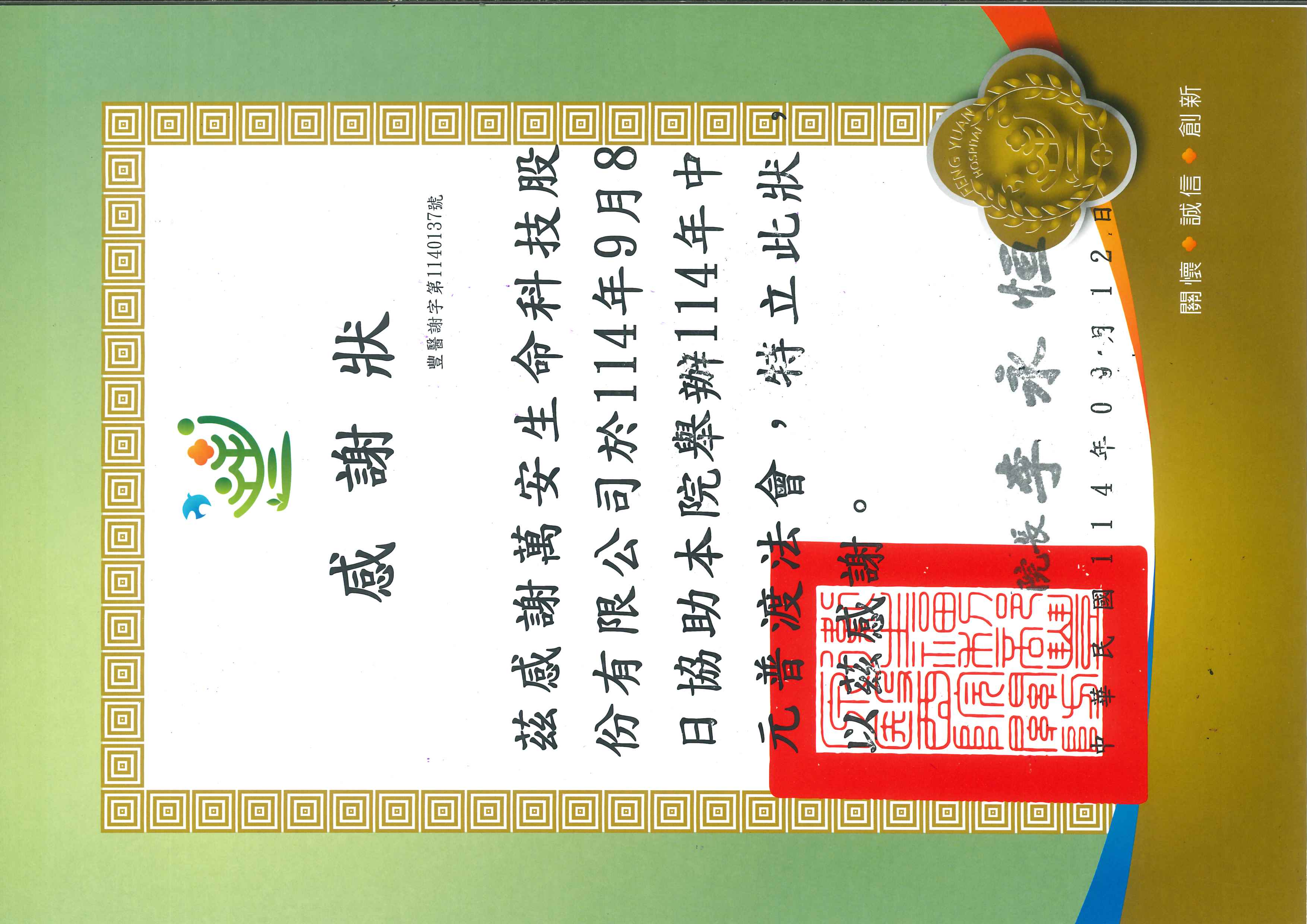 茲感謝萬安生命科技股份有限公司於114年9月8日協助本院舉辦114年中元普渡法會,特立此狀,以茲感謝。