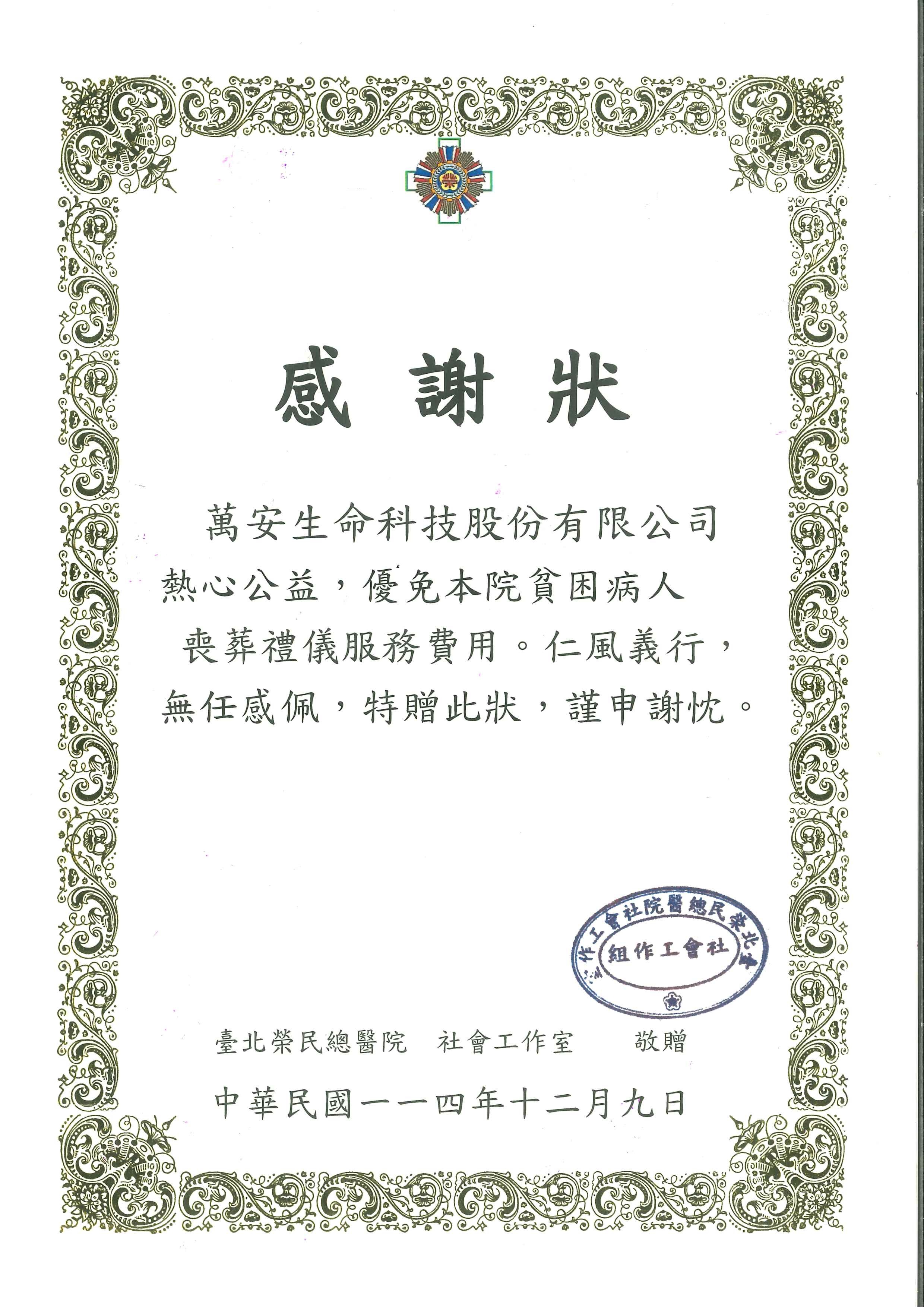 萬安生命科技股份有限公司熱心公益,優免本院貧困病人喪葬禮儀服務費用。仁風義行,無任感佩,特贈此狀,謹申謝忱。