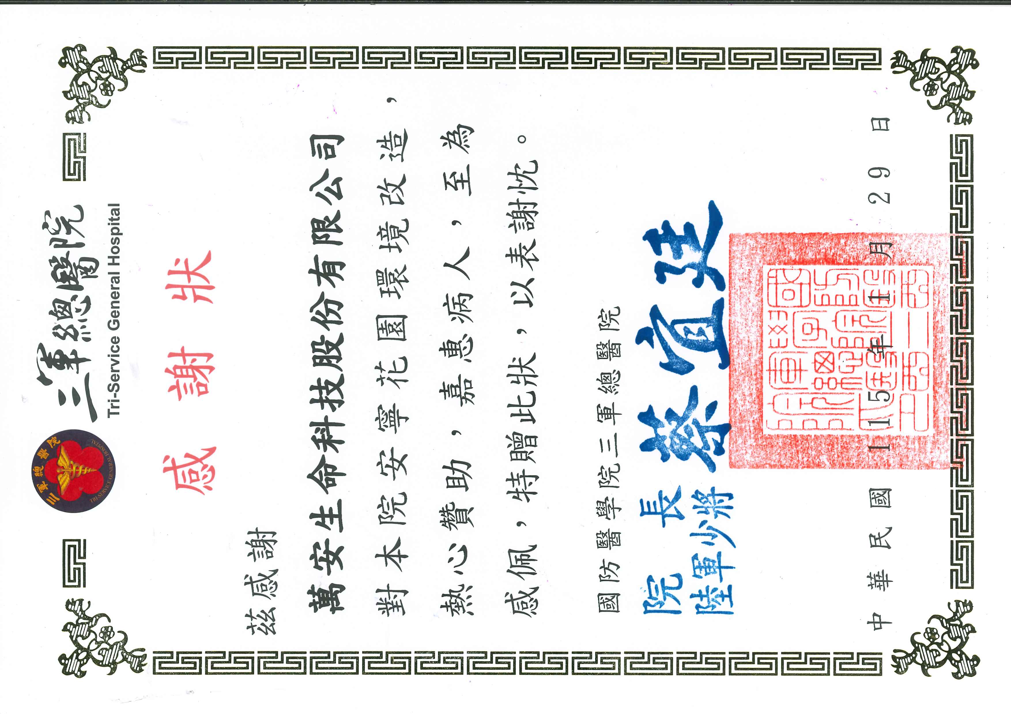 茲感謝萬安生命科技股份有限公司對本院安寧花園環境改造,熱心贊助,嘉惠病人,至為感佩,特贈此狀,以表謝忱。