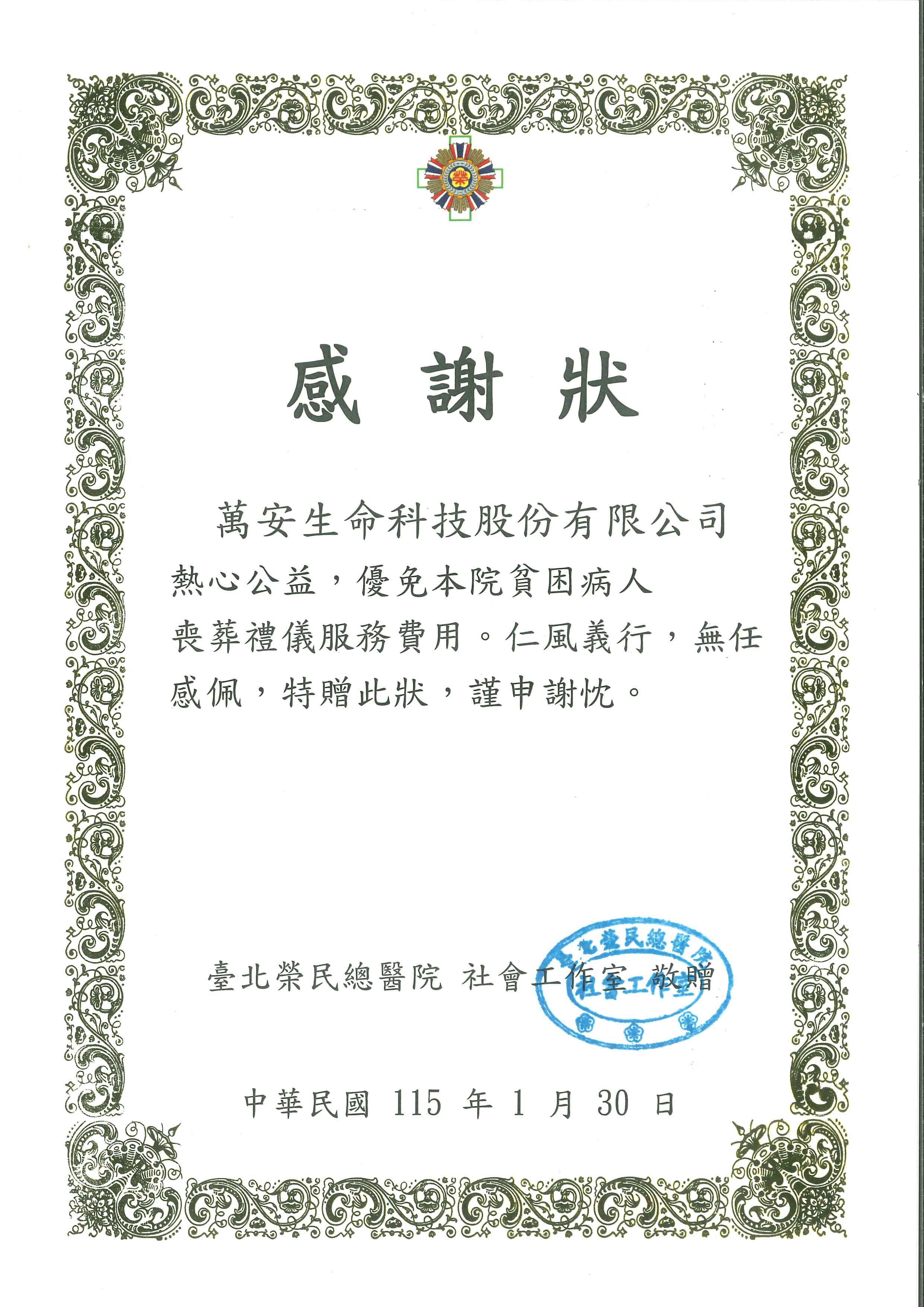 萬安生命科技股份有限公司熱心公益,優免本院貧困病人喪葬禮儀服務費用。仁風義行,無任感佩,特贈此狀,謹申謝忱。