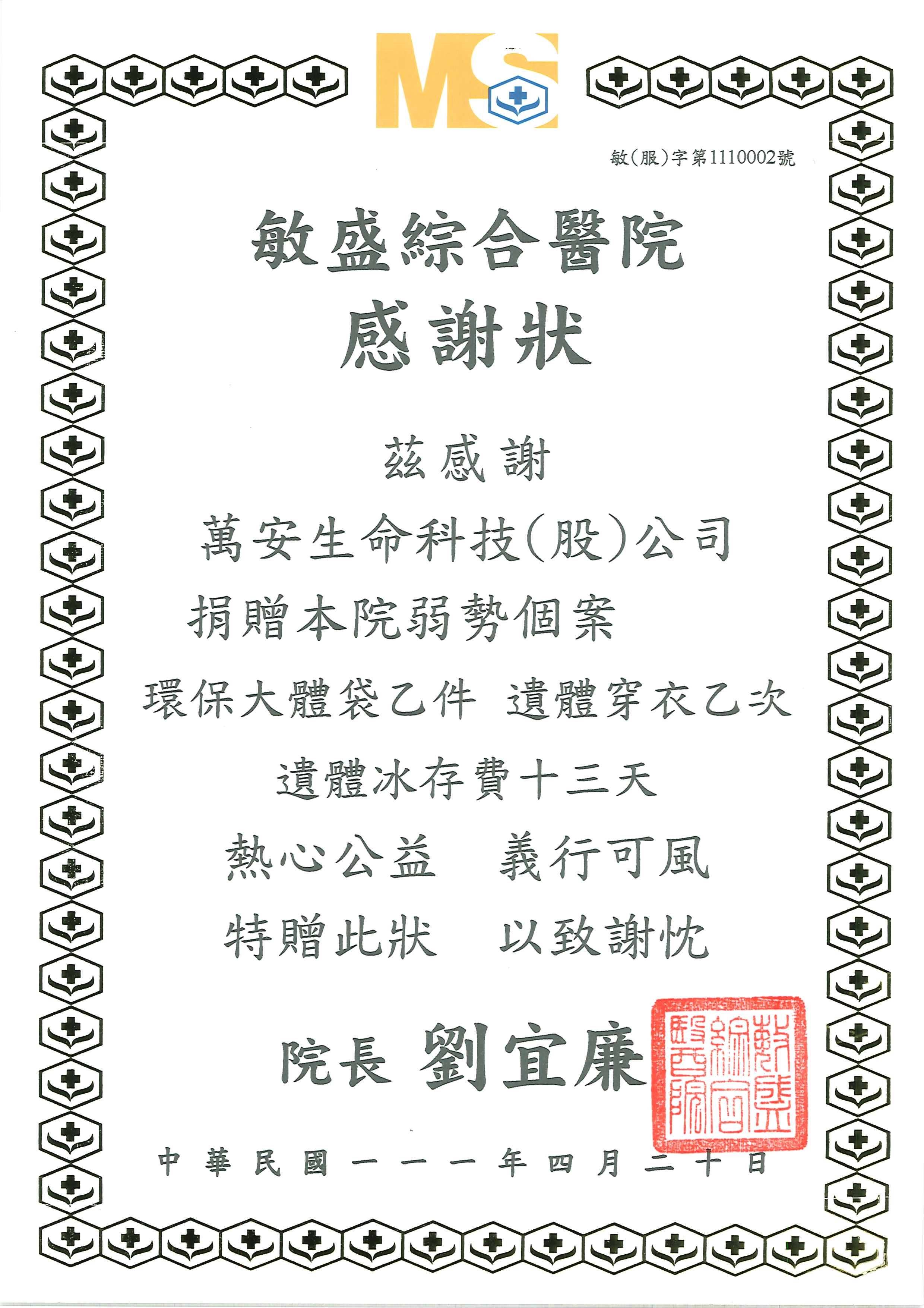敏盛綜合醫院感謝萬安生命捐贈本院弱勢個案環保大體袋乙件、遺體穿衣乙次、遺體冰存費十三天