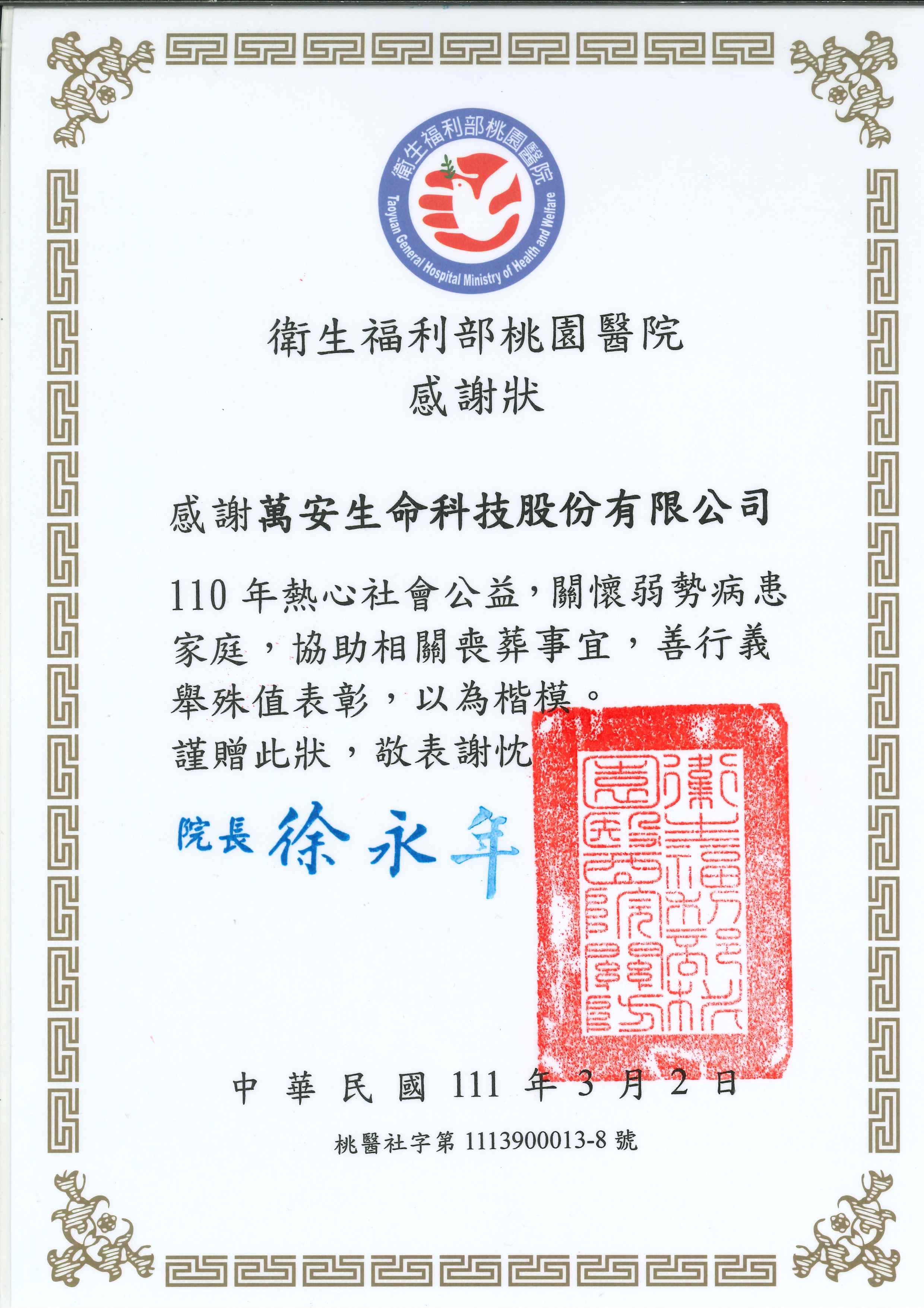 衛生福利部桃園醫院感謝萬安生命110年熱心社會公益,關懷弱勢病患,協助相關喪葬事宜。
