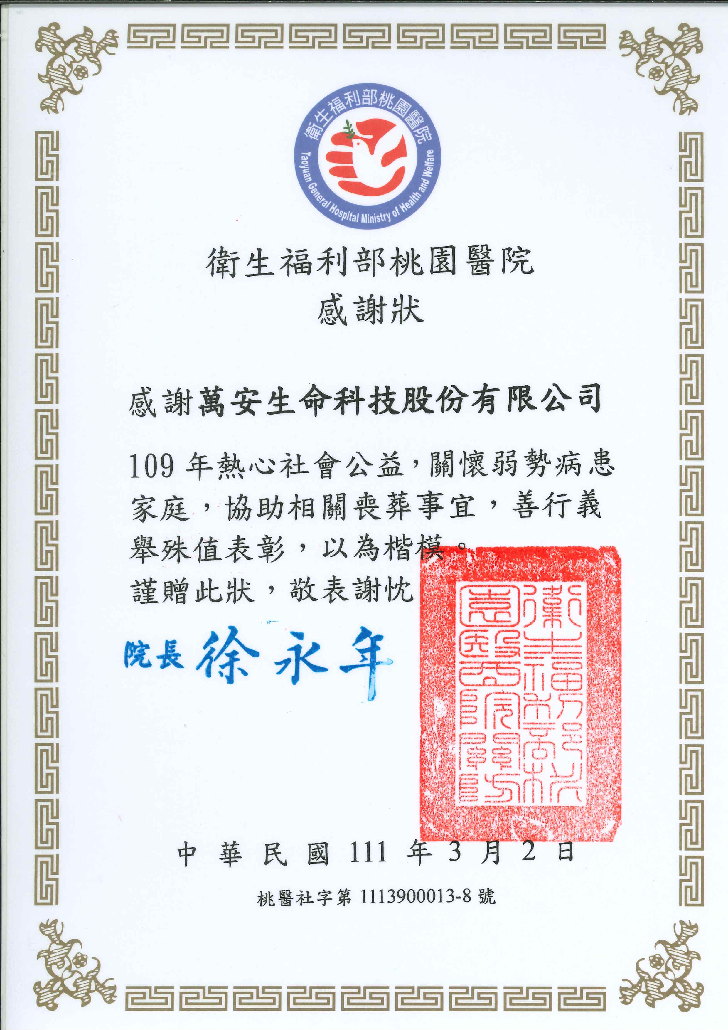衛生福利部桃園醫院感謝萬安生命109年熱心社會公益,關懷弱勢病患,協助相關喪葬事宜。