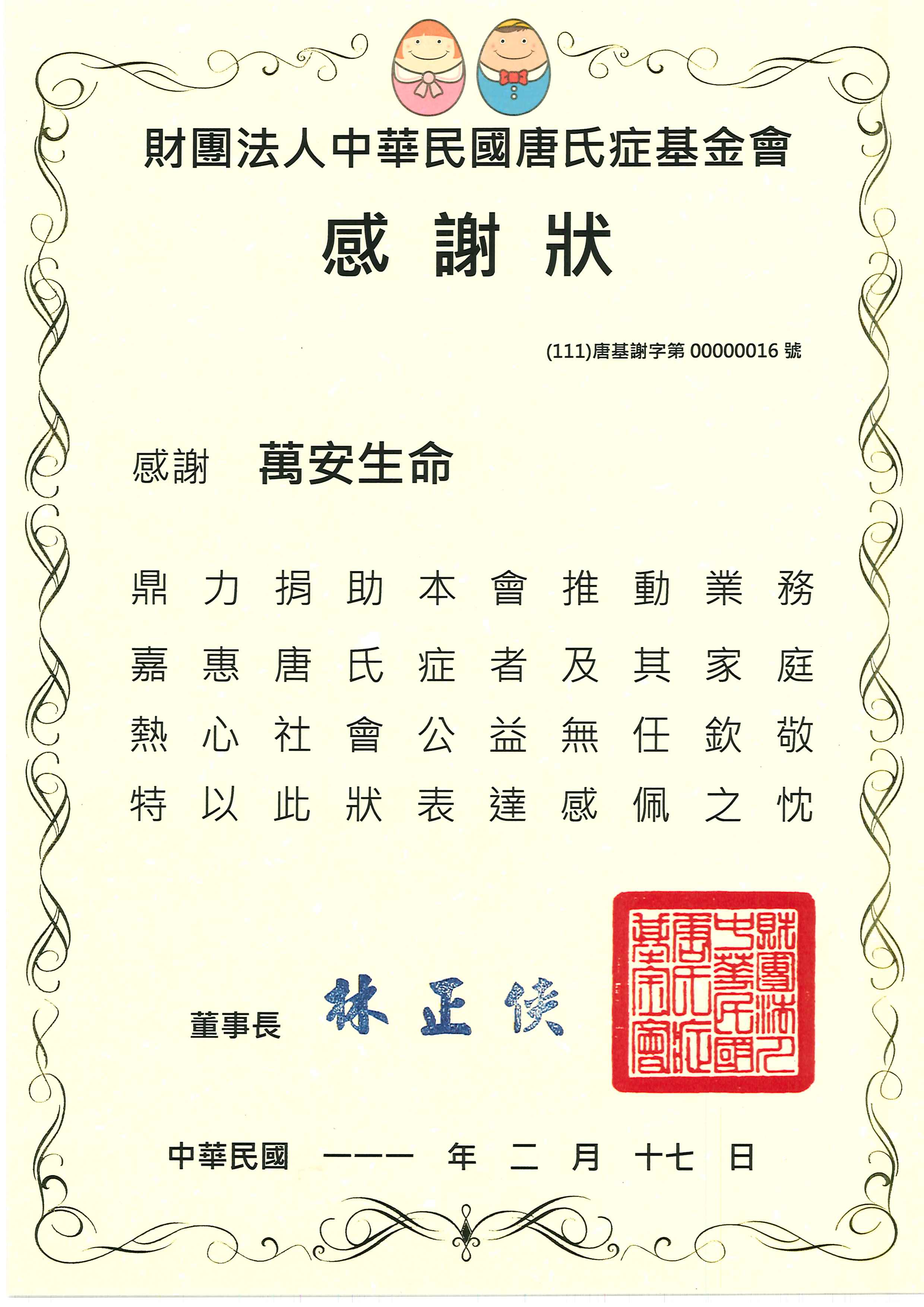 財團法人中華民國唐氏症基金會感謝萬安生命鼎力捐助本會推動業務佳會唐氏症者及其家庭