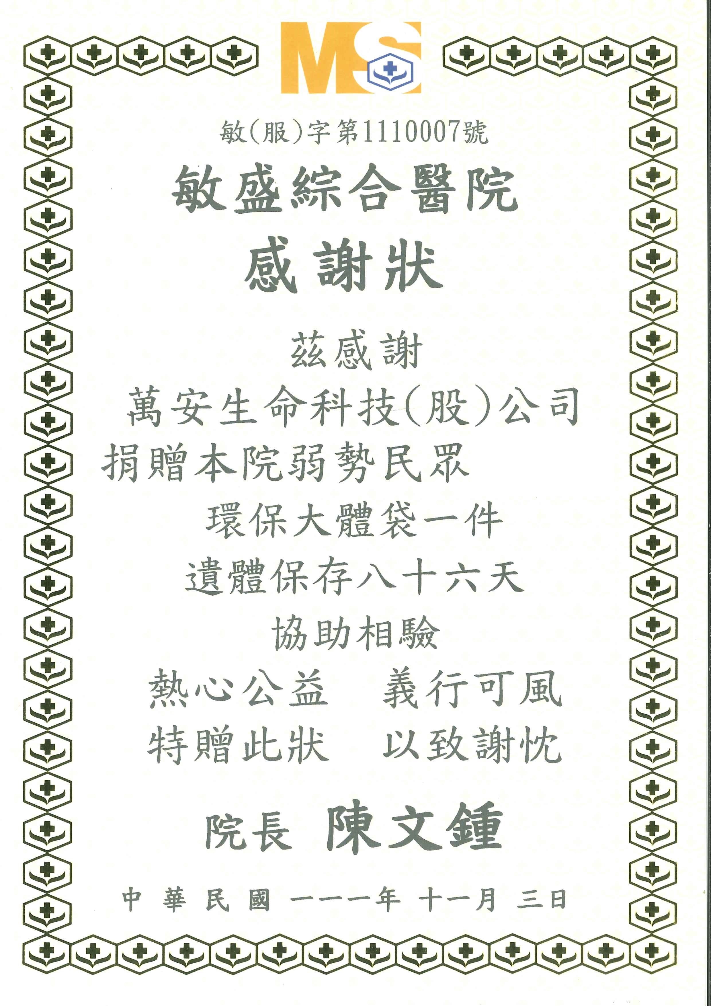 敏盛綜合醫院感謝萬安生命科技(股)公司捐贈本院弱勢民眾環保大體袋一件、遺體保存八十六天,協助相驗,熱心公益,義行可風,特贈此狀,以致謝忱。