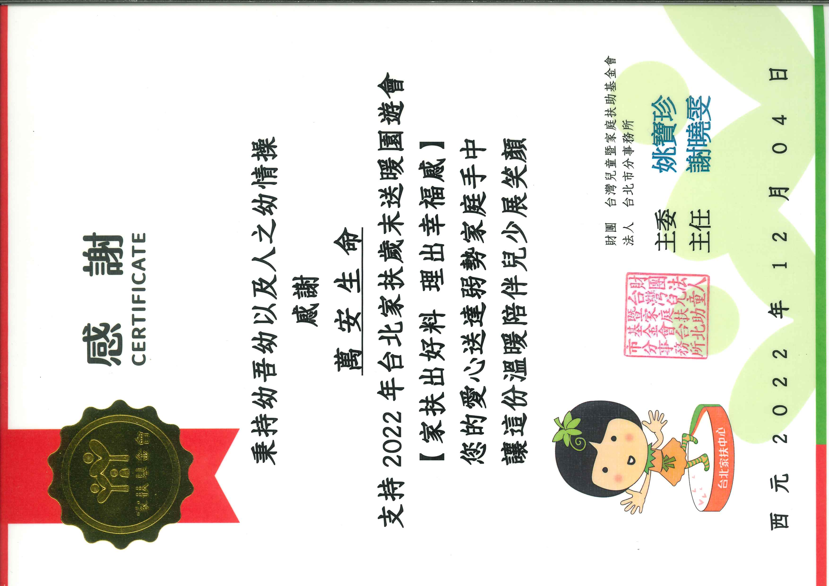 財團法人台灣兒童暨家庭扶助基金會台北市分事務所感謝萬安生命支持2022年台北家扶歲末送暖園游會