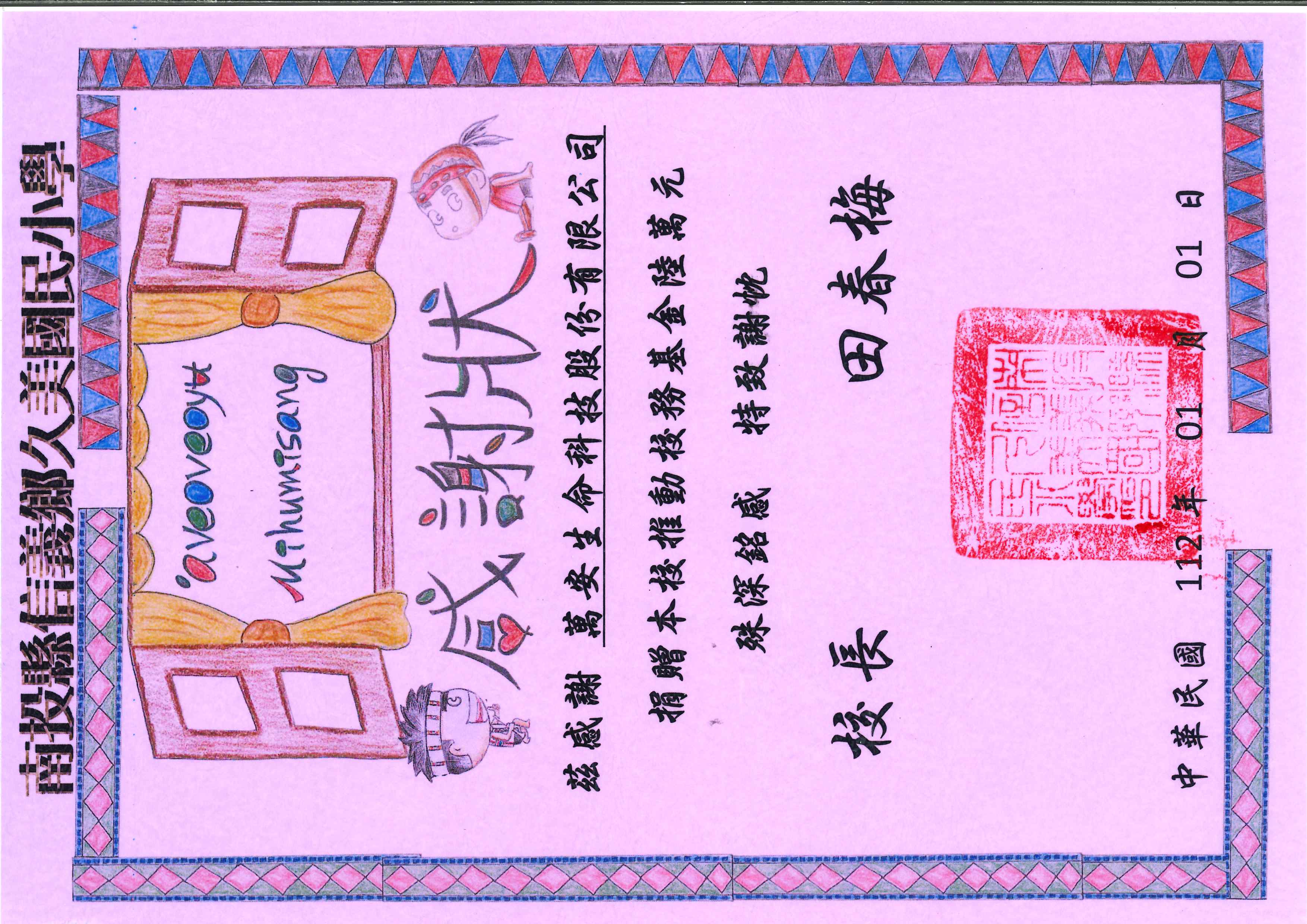 南投縣信義鄉久美國民小學茲感謝萬安生命科技股份有限公司捐贈本校推動校務基金
