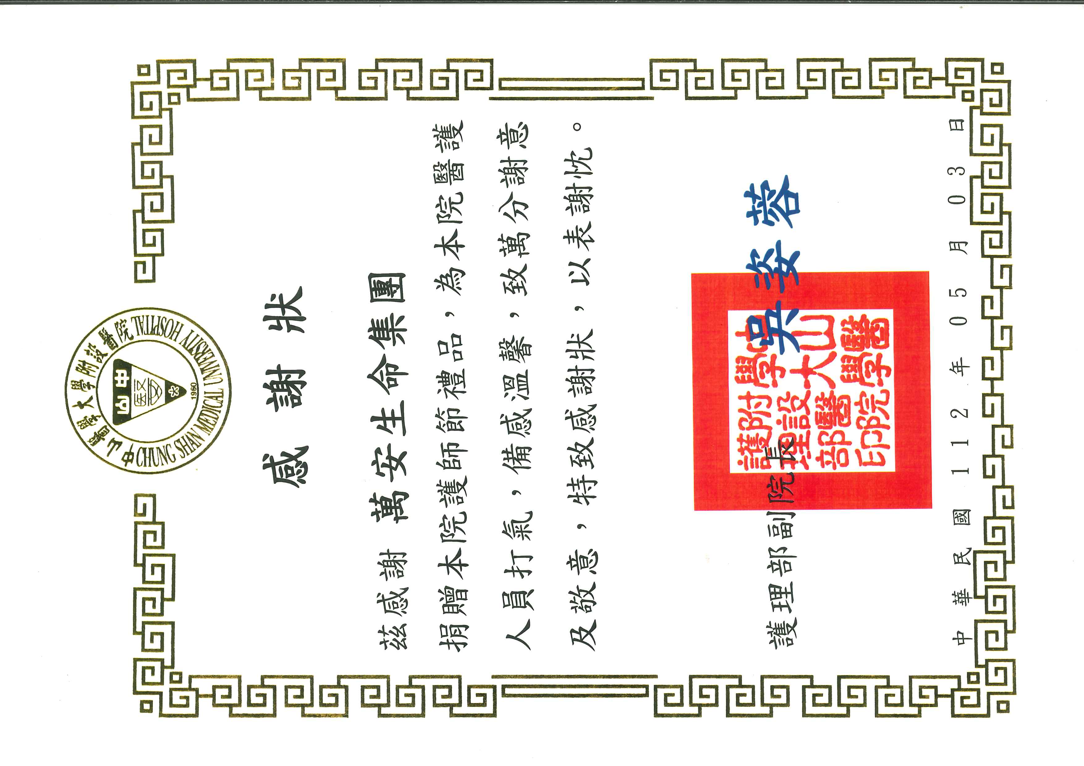 茲感謝萬安生命集團捐贈本院護師節禮品,為本院醫護人員打氣,備感溫馨,致萬分謝意及敬意