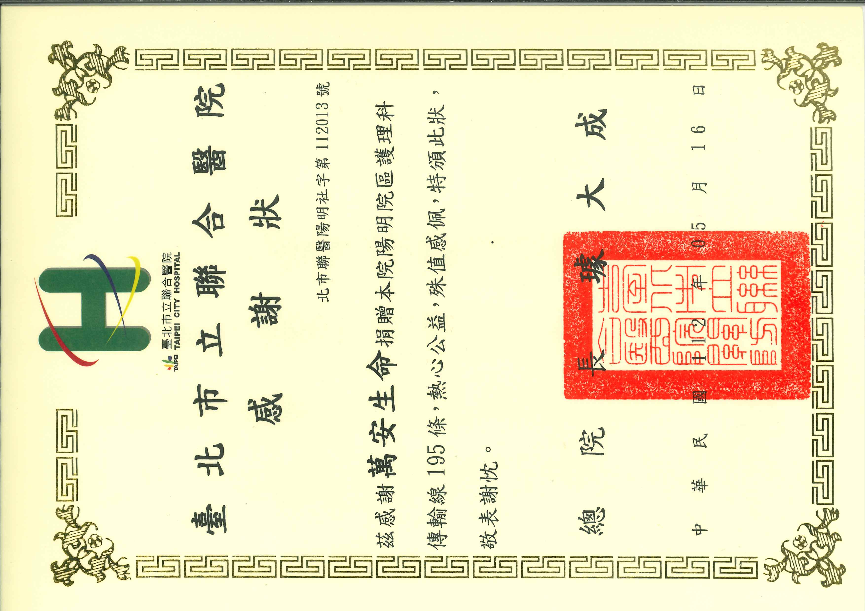 茲感謝萬安生命捐贈本院陽明院區護理科傳輸線195條,熱心公益。殊值感佩,特頒此狀,敬表謝忱。