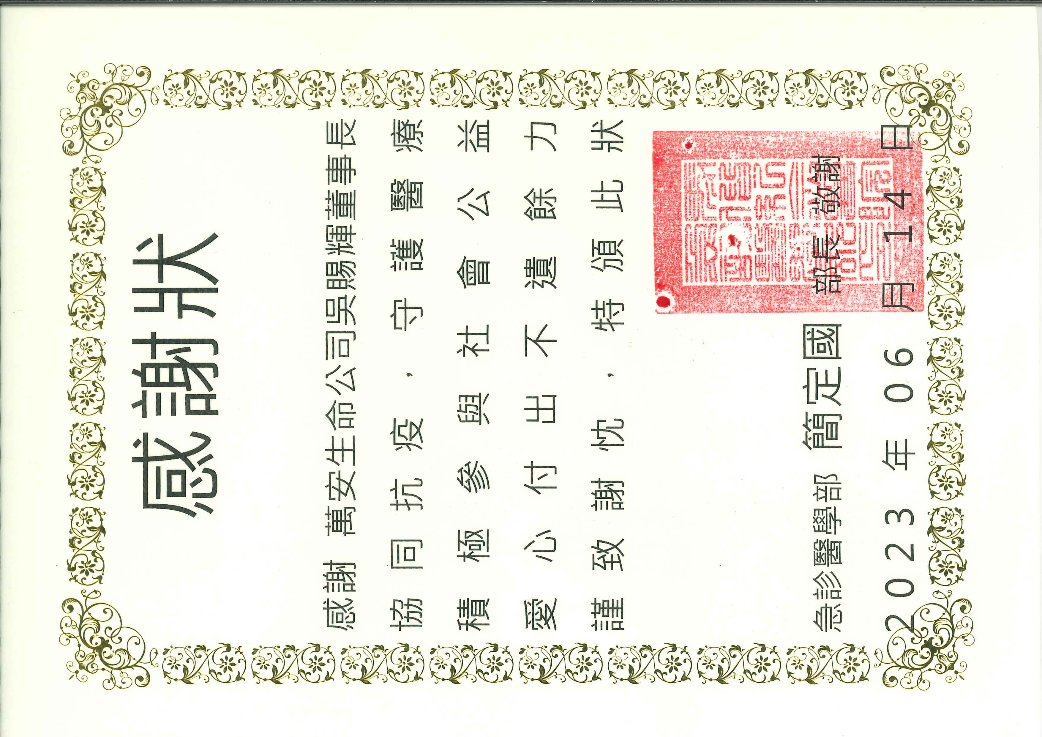 感謝萬安生命公司吳賜輝董事長協力抗疫,守護醫療積極參與社會公益愛心付出不遺餘力,謹致謝枕,特頒此狀。