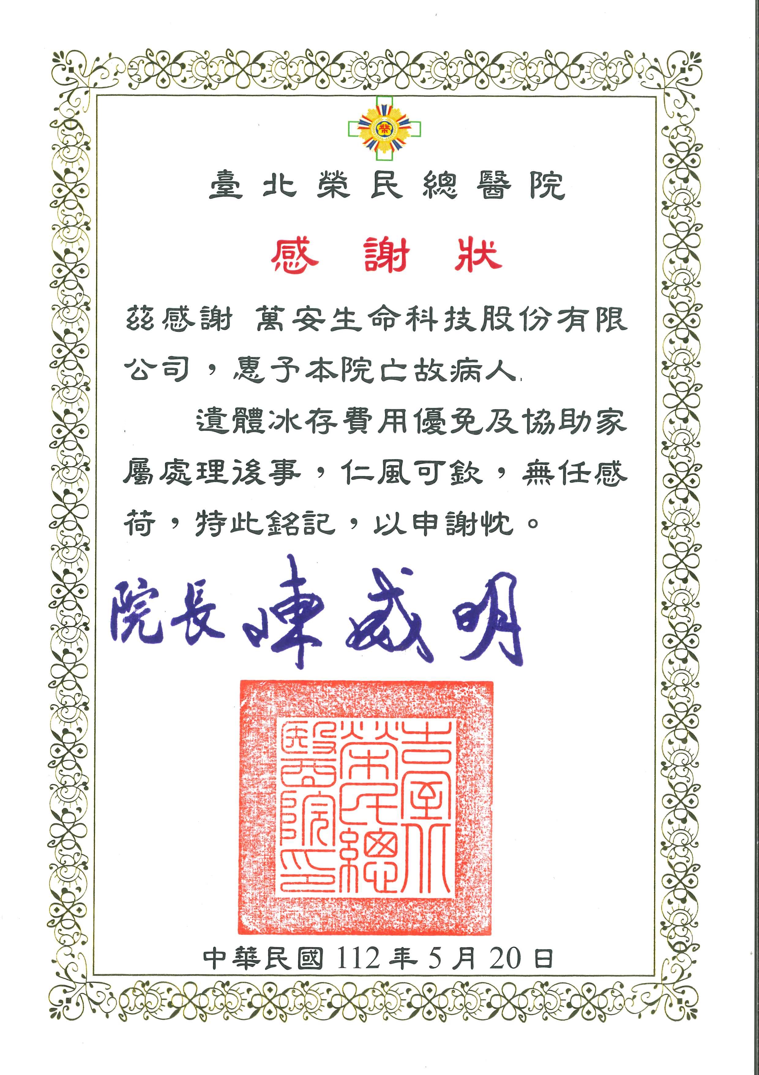 茲感謝萬安生命科技股份有限公司,惠予本院亡故病人遺體冰存費用優免及協助家屬處理後事,仁風可欽,無任感荷,特此銘記