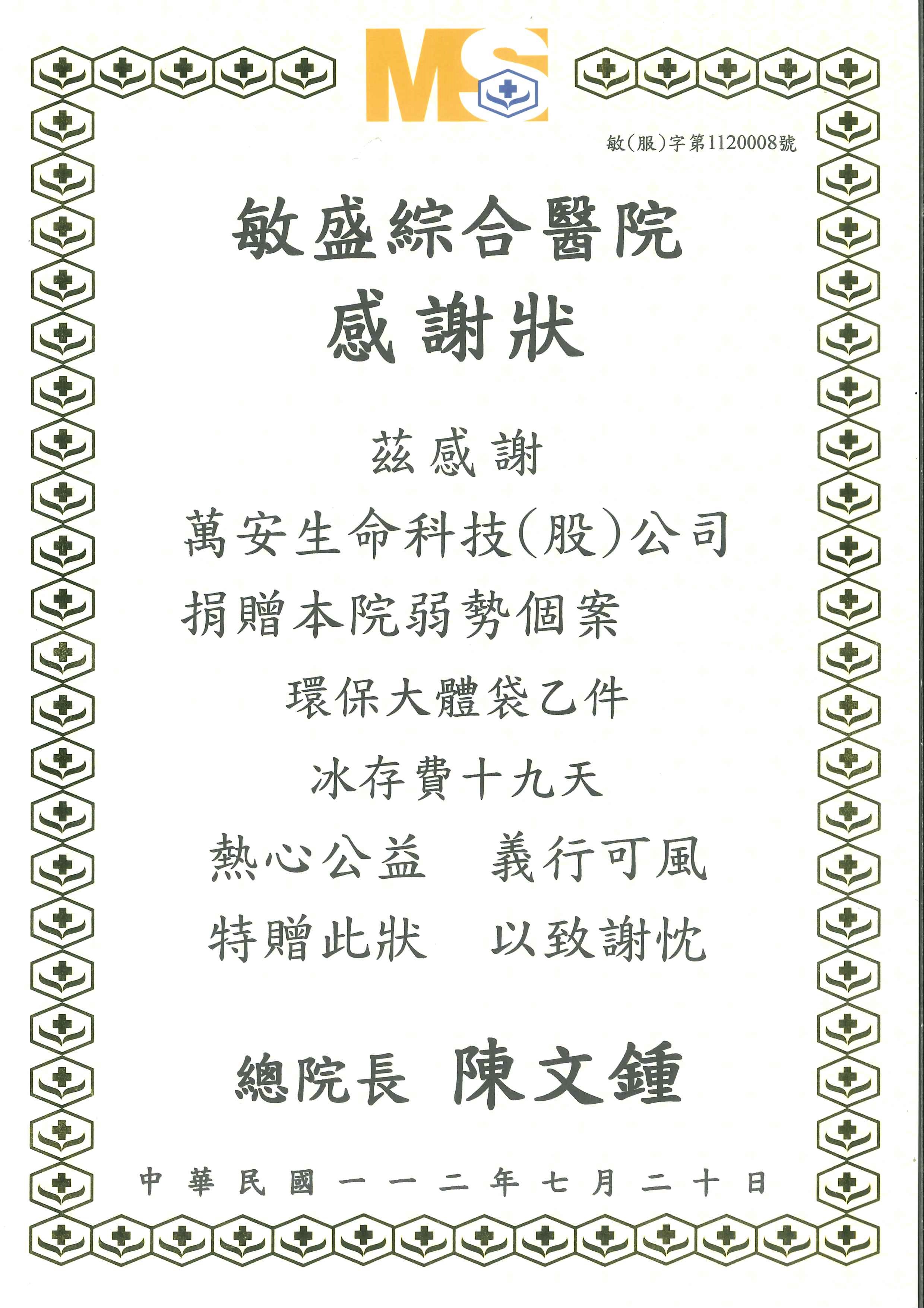 茲感謝萬安生命科技(股)公司捐贈本院弱勢環保大體袋乙件,冰存費十九天,熱心公益,義行可風,特贈此狀,以致謝忱。