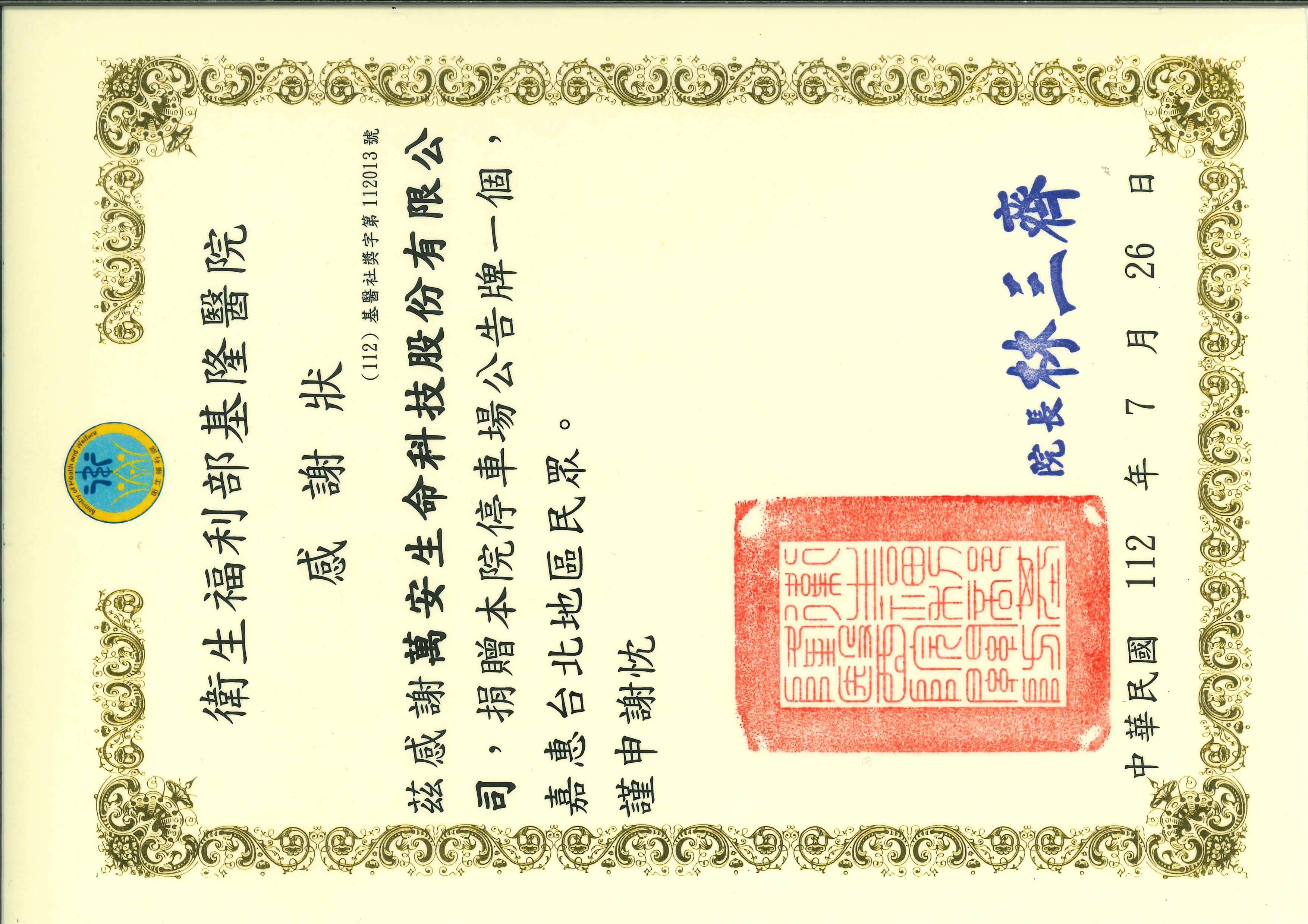 茲感謝萬安生命科技股份有限公司,捐贈本院停車場公告牌一個,嘉惠台北地區民眾,謹申謝枕。