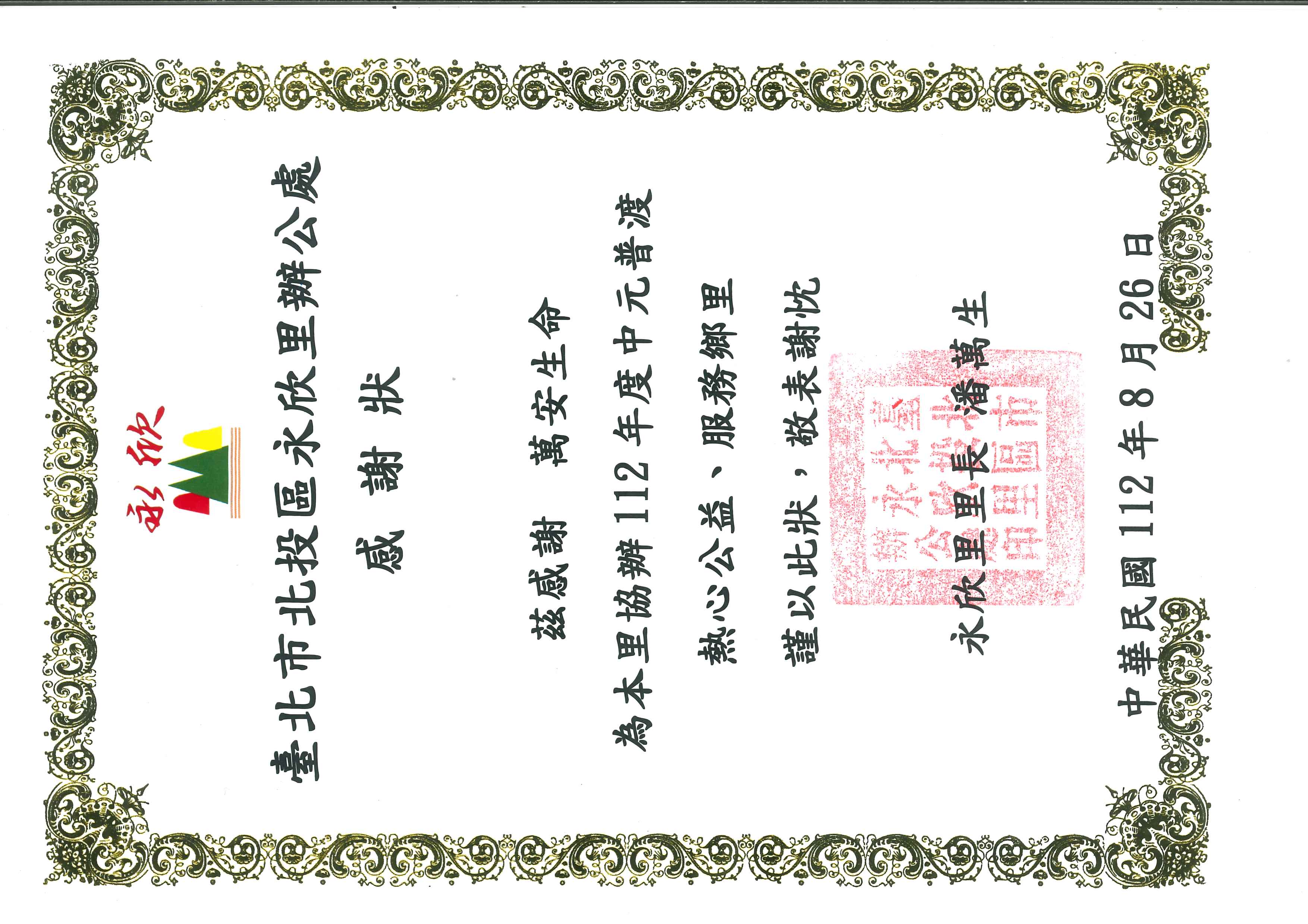 茲感謝萬安生命為本里協辦112年度中元普渡,熱心公益、服務鄉里,謹以此狀,敬表謝忱。