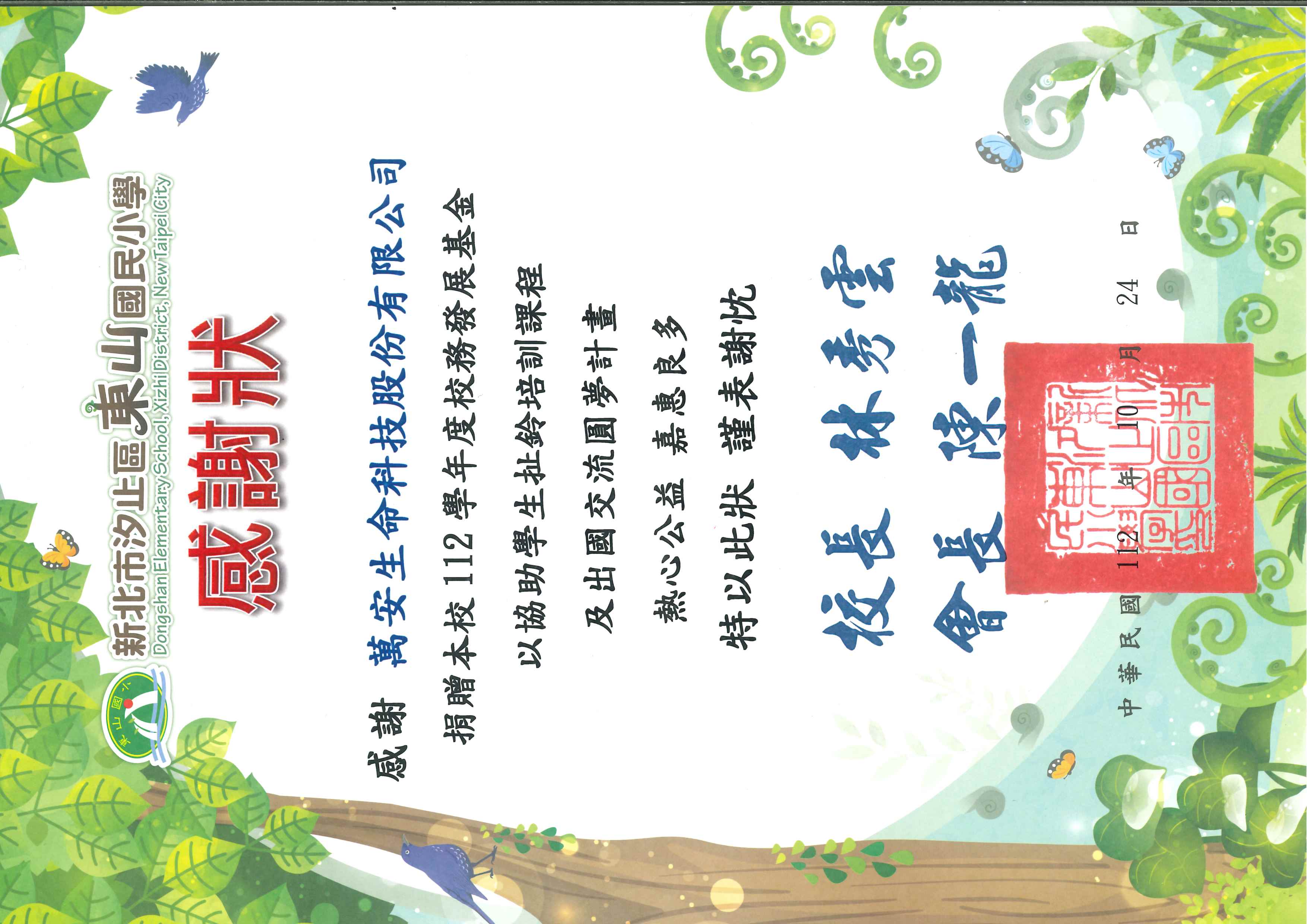 感謝萬安生命科技股份有限公司捐贈本校112學年度校務發展基金,協助學生,熱心公益,嘉惠良多,特以此狀,謹表謝忱。