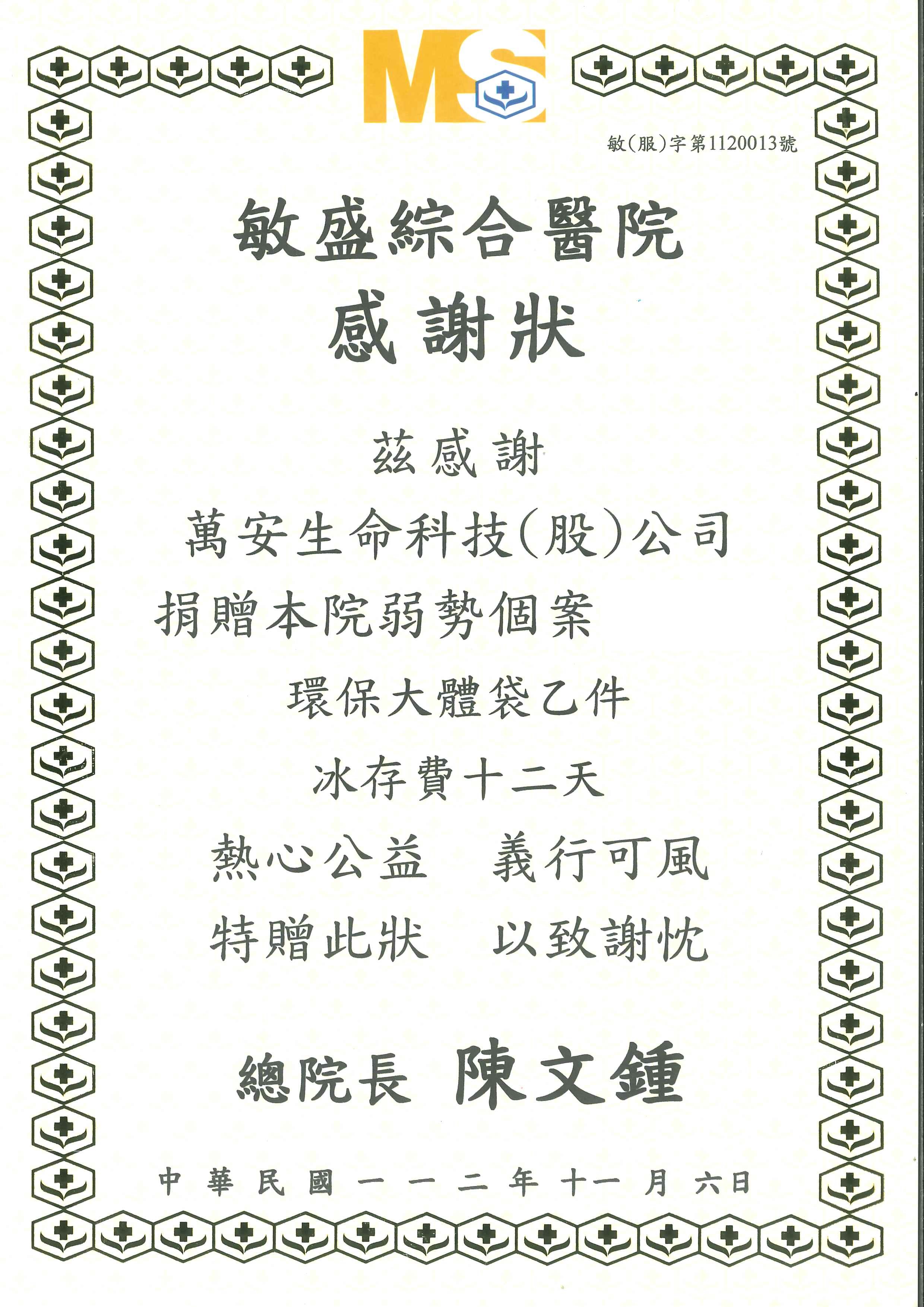 茲感謝萬安生命科技(股)公司捐贈本院弱勢個案環保大體袋乙件,冰存費十二天,熱心公益,義行可風,特贈此狀,以致謝忱。