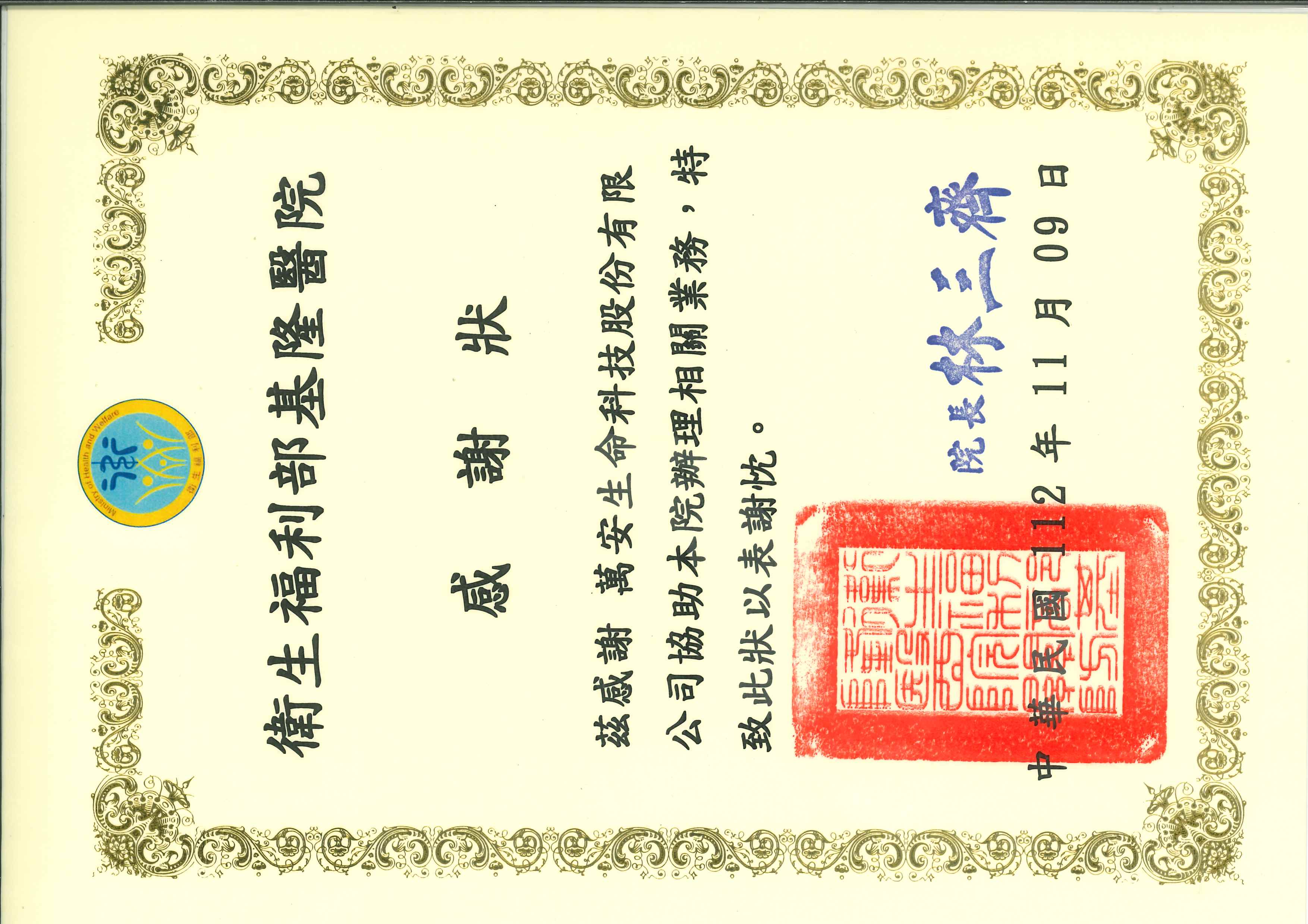茲感謝萬安生命科技股份有限公司協助本院辦理相關業務,特致此狀以表謝枕。