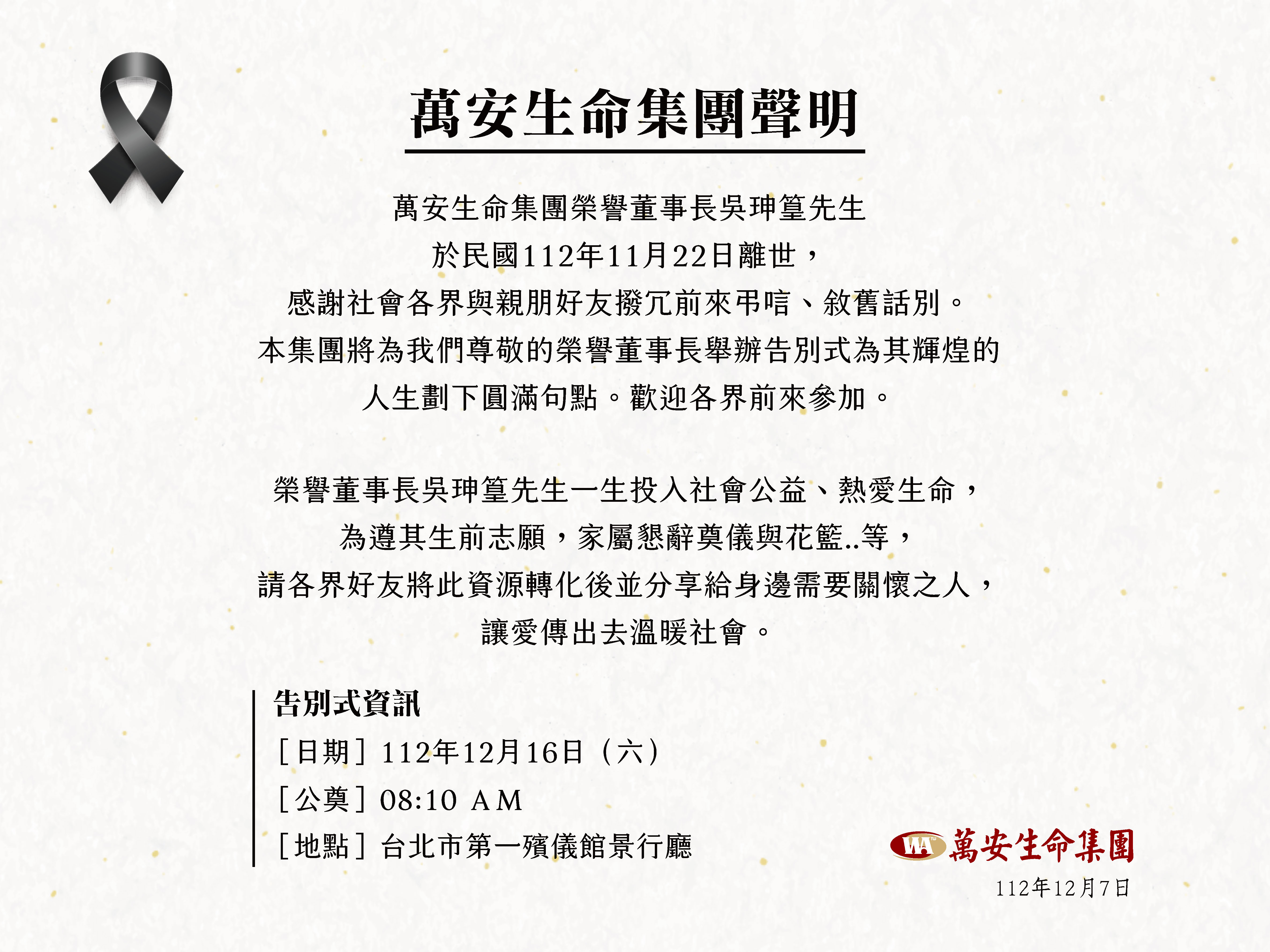 公告|榮譽董事長告別式日期